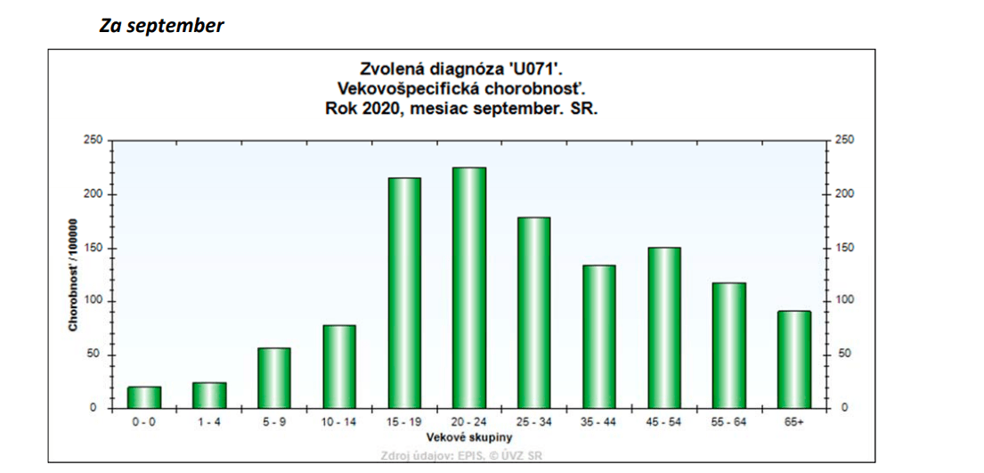 Najväčšia chorobnosť je stále u mladých ľudí od 15 do 34 rokov, v septembri však stúpla chorobnosť aj u starších ľudí nad 65 rokov na 11,5 % oproti 8,5 % v auguste a 5,9 % v júli.