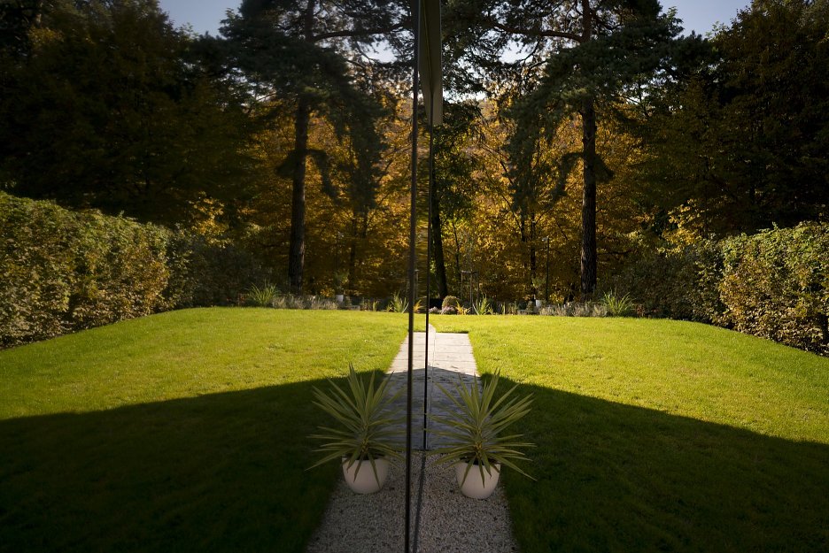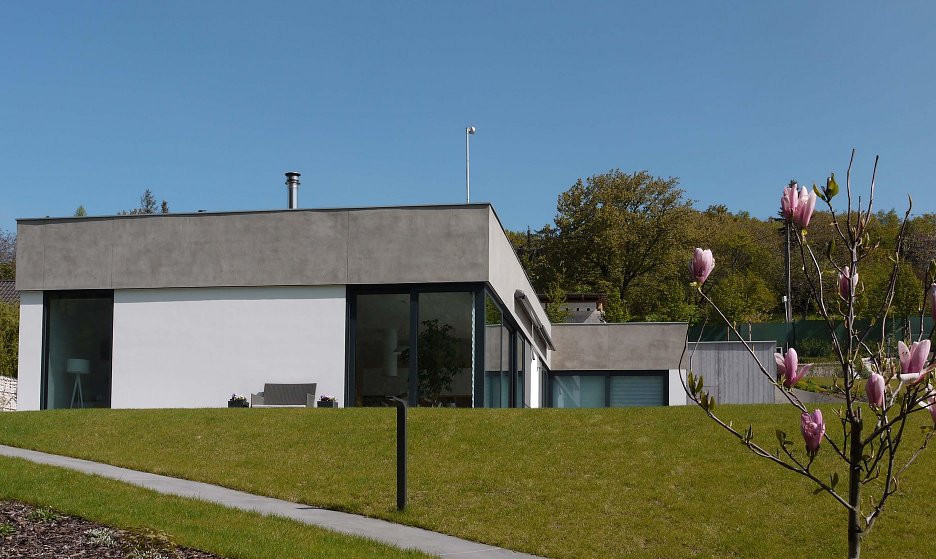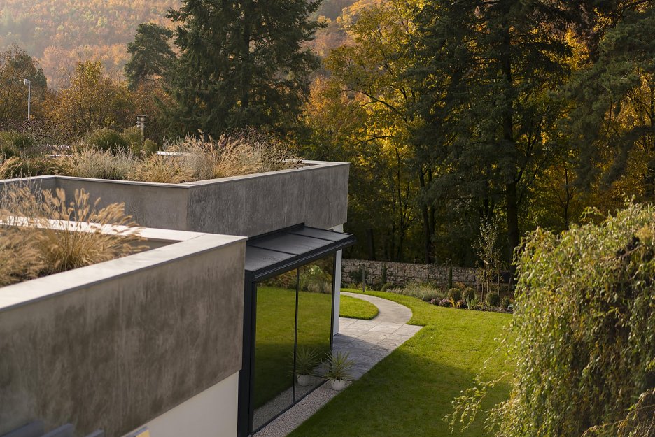 • Jednopodlažný dom v rozsiahlej, mierne svahovitej parcele. Výborná komunikácia s okolitým terénom, čiastočné zapustenie do zeme (terén a strecha jedno sú...). Všetko na jednej úrovni - bezbariérové. Hranica medzi "dnu" a "von" je dynamická, dá sa hocikedy zrušiť, otvoriť, prepojiť. Dôležitejší, ako samotná architektonická forma, je kontakt s okolitou krajinou.