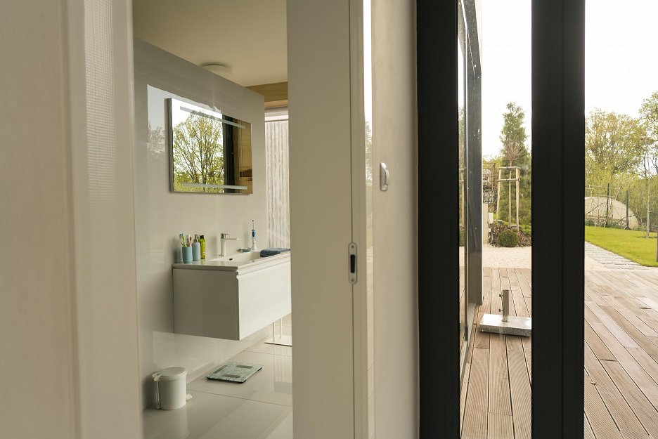 Miera flexibility otvorených a uzavretých foriem, ich prienik, spojenie a oddeľovanie bolo priamo úmerné možným investičným nákladom. Jednopodlažná dispozícia umožňuje priame prepojenie priestorov voči okolitému prostrediu. Strecha je takmer celá súčasťou záhrady a tým podporuje zachovanie pôvodnej veľkosti zelenej plochy.