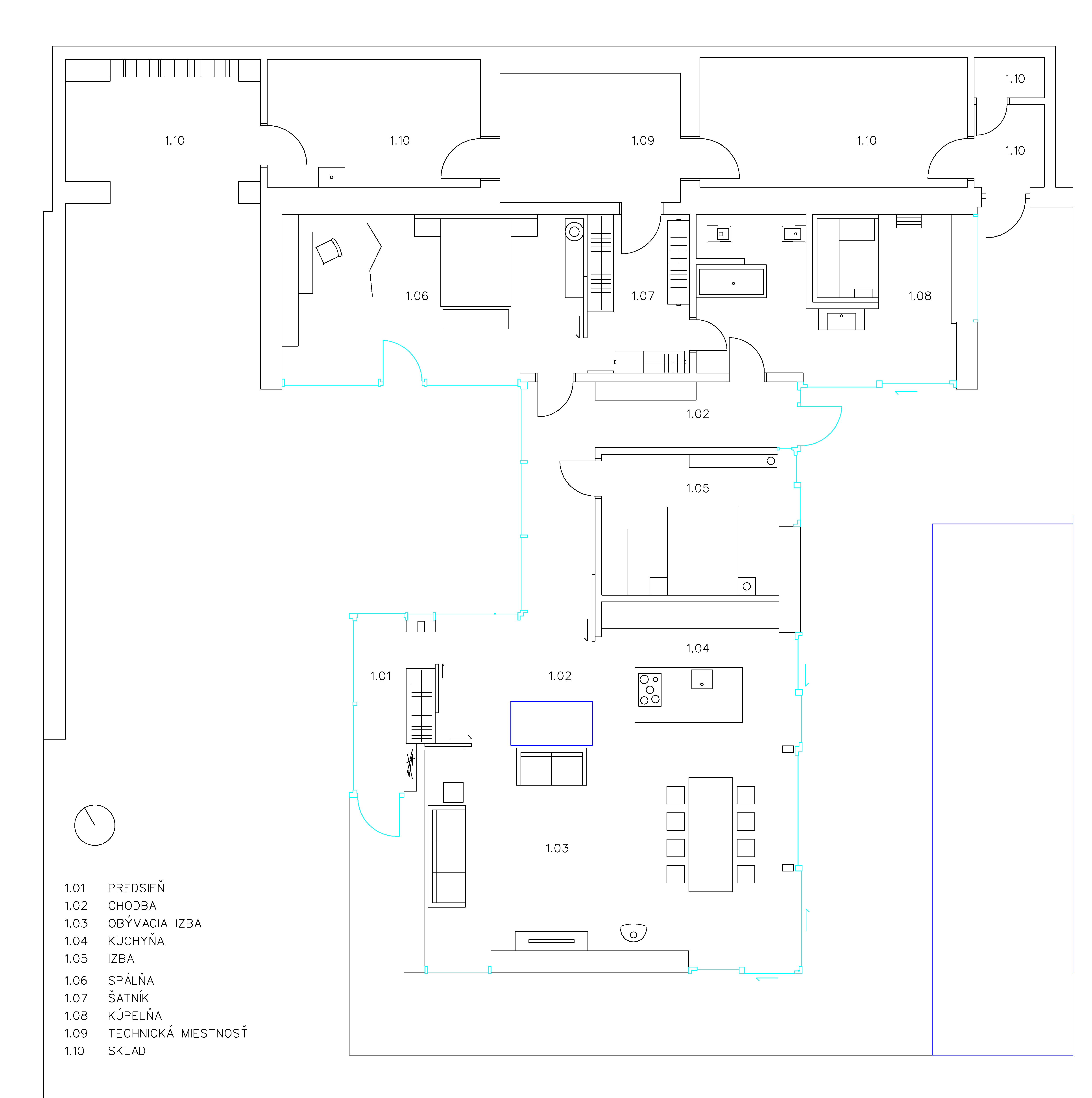 Pôdorys, (pozn. red.: na Slovensku málo vídaný otvorený typ dispozície s priamym transparentným kontaktom na okolie)