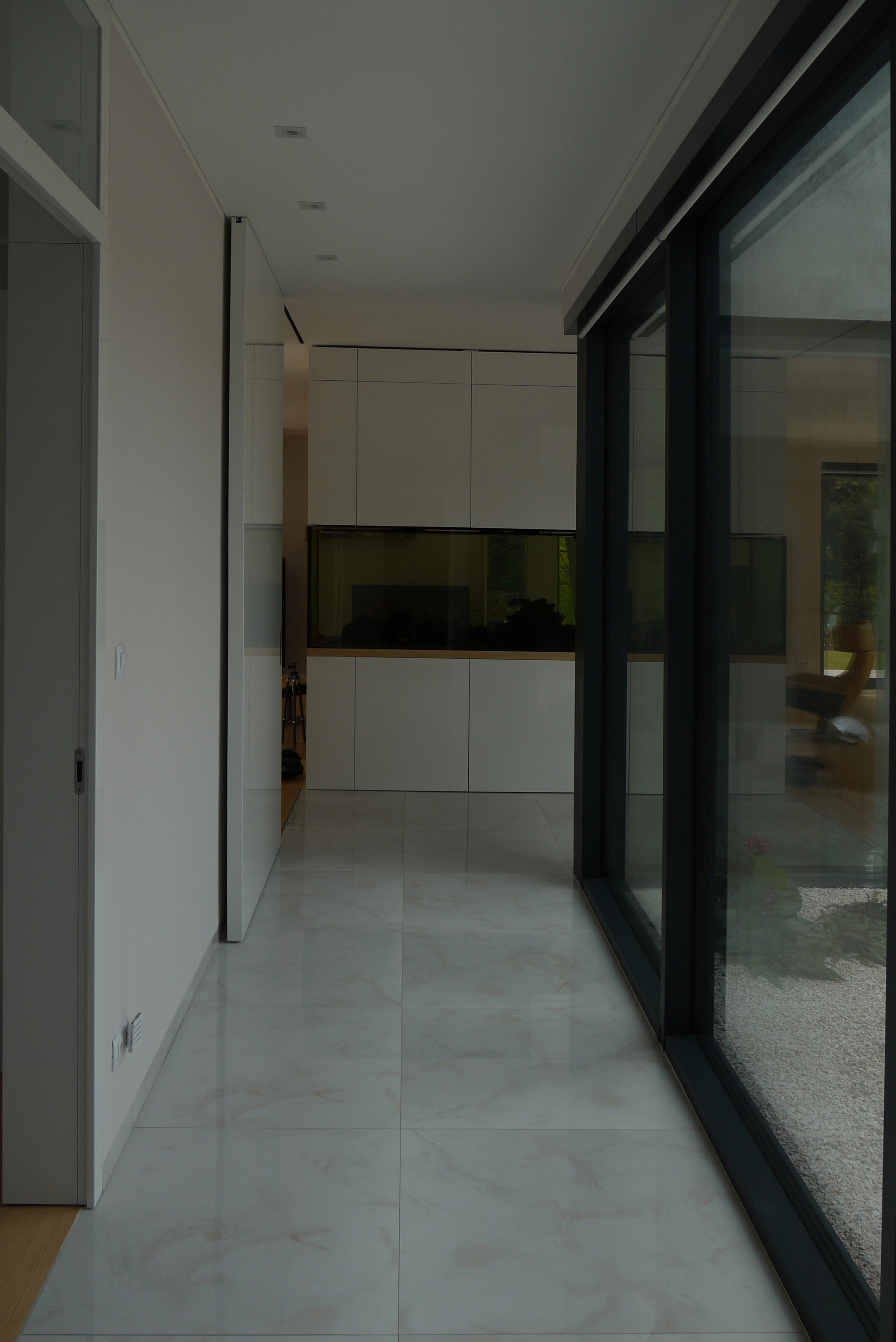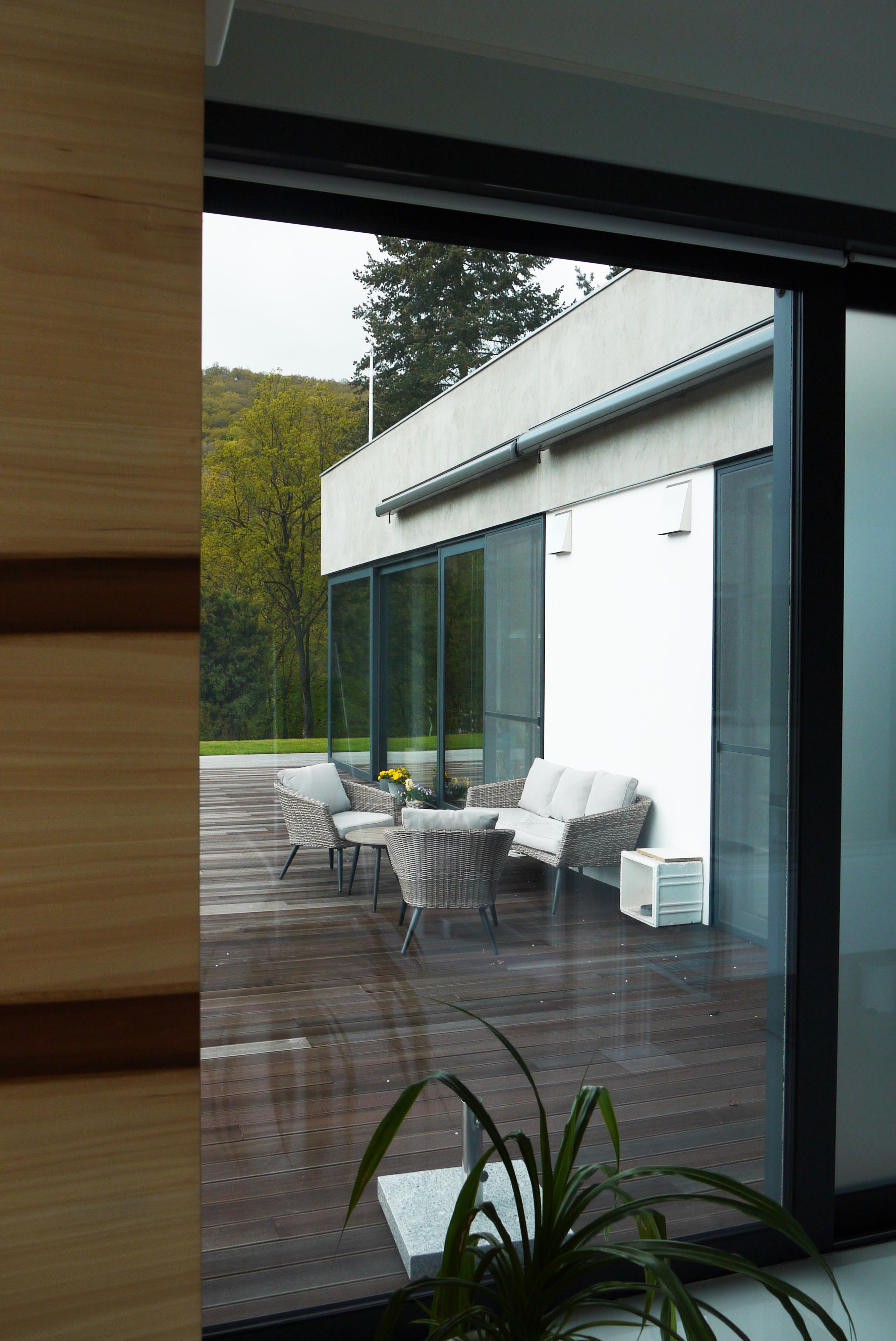 • Jednopodlažný dom v rozsiahlej, mierne svahovitej parcele. Výborná komunikácia s okolitým terénom, čiastočné zapustenie do zeme (terén a strecha jedno sú...). Všetko na jednej úrovni - bezbariérové. Hranica medzi "dnu" a "von" je dynamická, dá sa hocikedy zrušiť, otvoriť, prepojiť. Dôležitejší, ako samotná architektonická forma, je kontakt s okolitou krajinou.