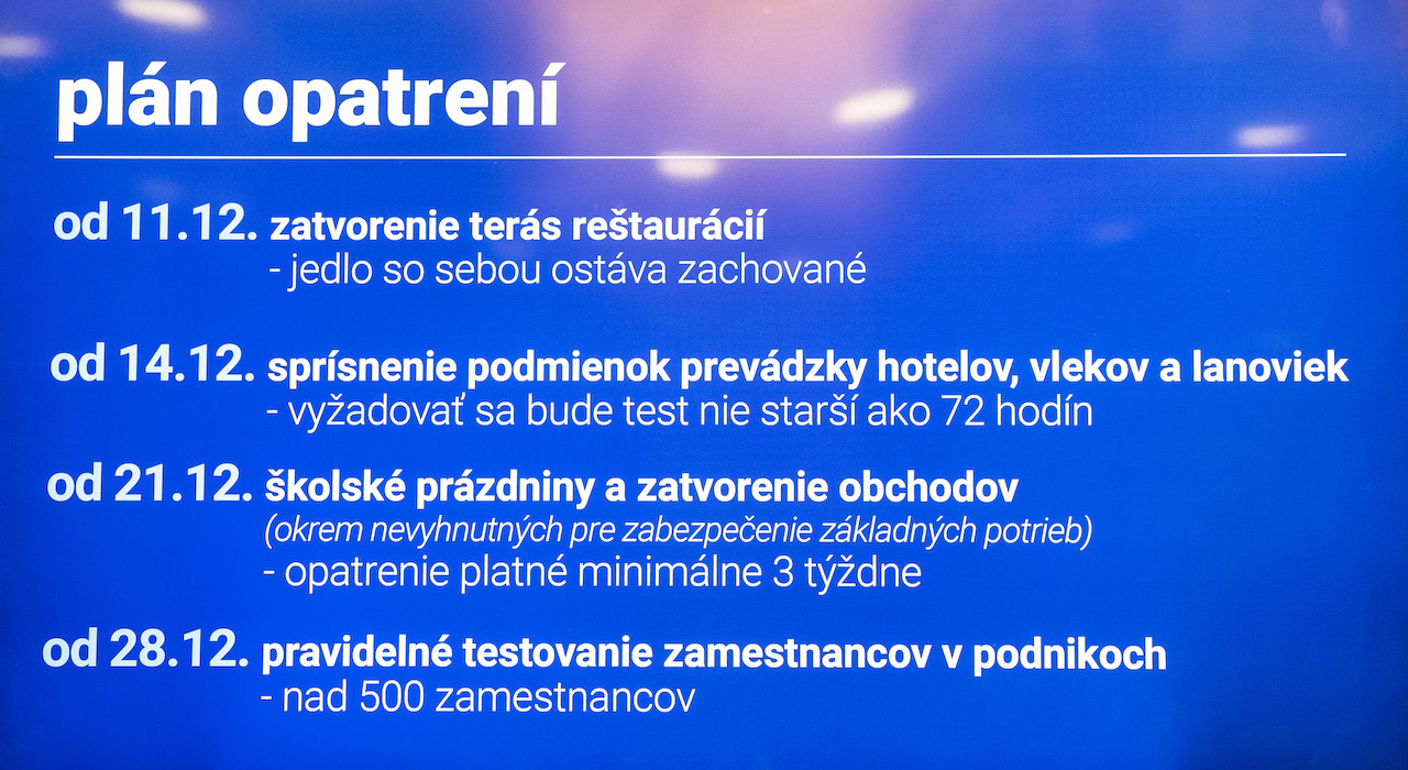 Od 11. 12. sa zatvoria terasy reštaurácií. Prevádzky s občerstvením môžu podávať jedlo iba cez okienko. Ján Mikas však vyslovene varoval pred vianočnými trhmi, ktoré sú vysoko rizikové a vyzval samosprávy, aby ich zrušili.