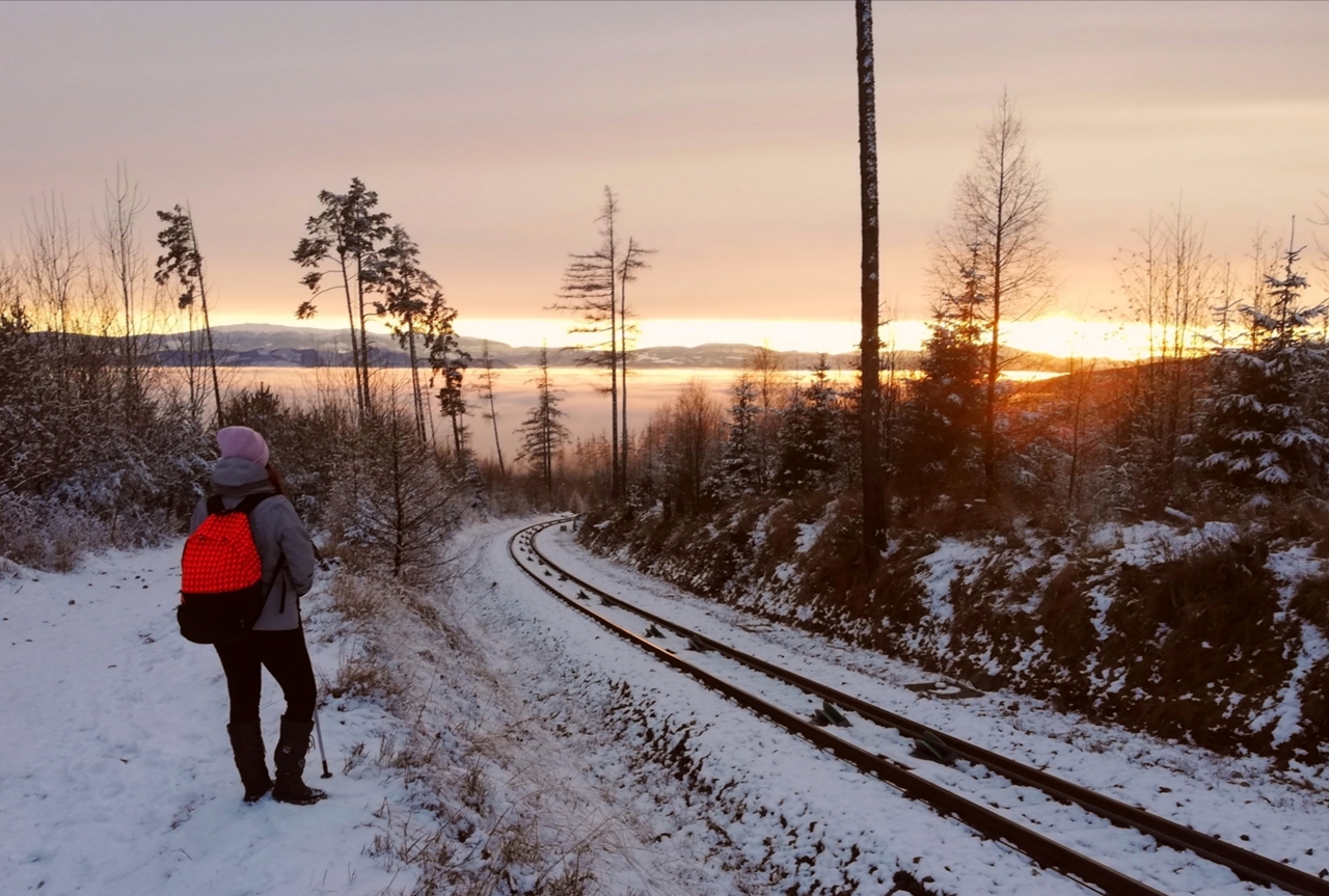 Auto parkujeme v Starom Smokovci a už odtiaľto začína naša túra. Kto chce, môže sa na Hrebienok vyviezť pozemnou lanovkou, alebo si aj tieto približne 3 km do kopca odkráčať. Už tu nás v Tatrách vítala prvá inverzia so silno oranžovými svetlami slnka. Bolo to ako ocitnúť sa v inom svete. Dole bolo predsa zamračené a vyzeralo to na sychravé počasie. Len pár minút kráčania a všetko sa zmení: