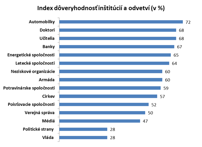 Za bankami skončili v dôveryhodnosti energetické a letecké spoločnosti, armáda a neziskové organizácie. Na opačnom konci rebríčka sa umiestnili politické strany, ktoré v indexe dôveryhodnosti dosiahli 28 %, pričom 0 znamená najmenej dôveryhodný a 100 najdôveryhodnejší.