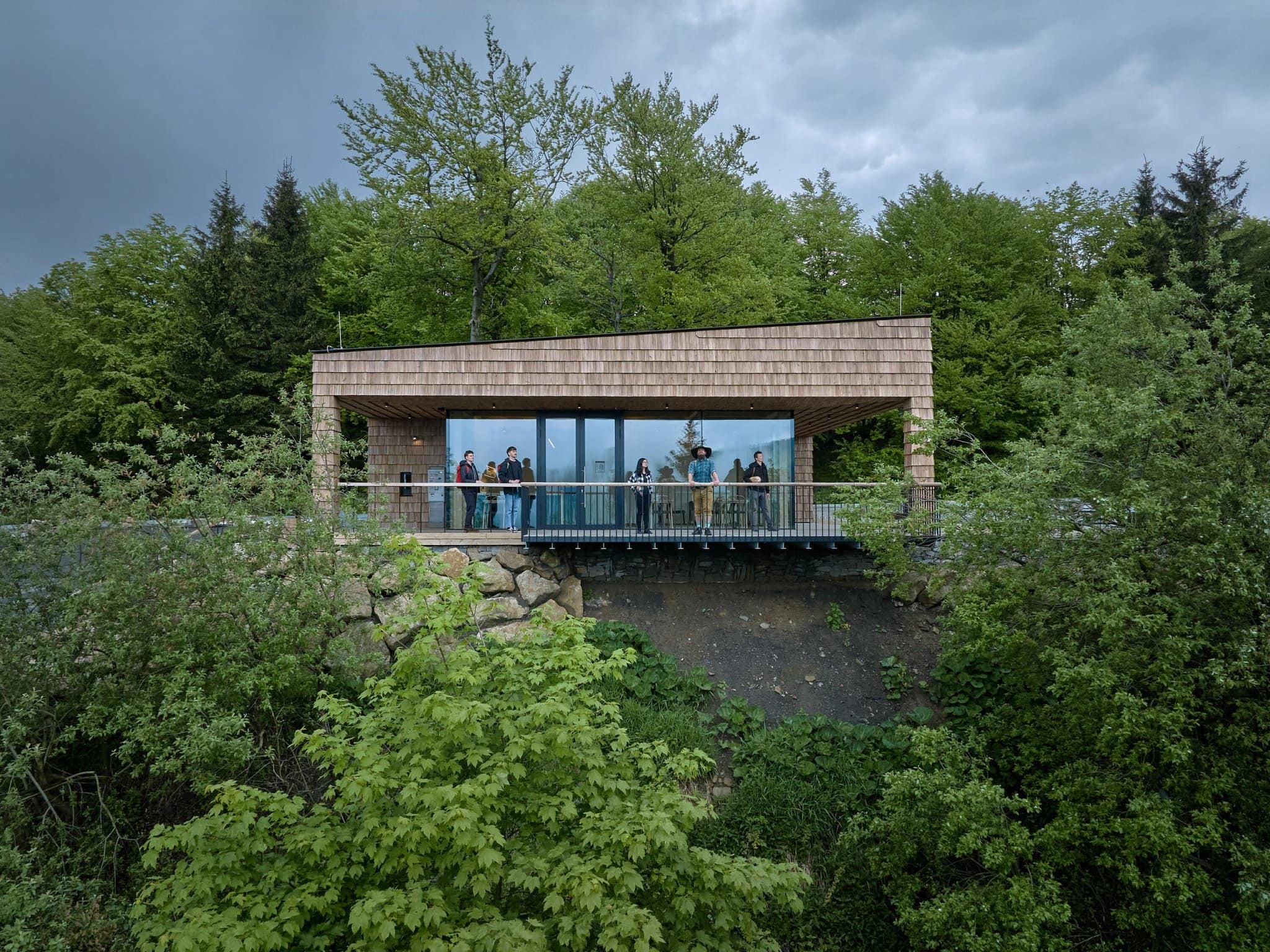 Dom je postavený ako drevostavba s rámovou konštrukciou a strechou z lepených väzníkov. Fasáda zo šindľov odkazuje na tradičnú miestnu stavebnú techniku, zatiaľ čo zelená strecha s horskou vegetáciou nadväzuje na okolité lúky. Pieskovcové dlažby a múry odhaľujú vnútornú krásu kamenného hromadiska Beskýd.