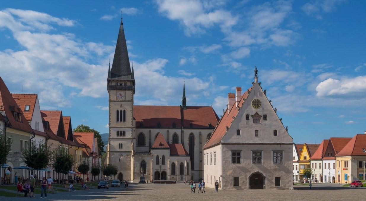 Uprostred Radničného námestia v Bardejove stoja pri sebe Mestská radnica a Bazilika svätého Egídia.