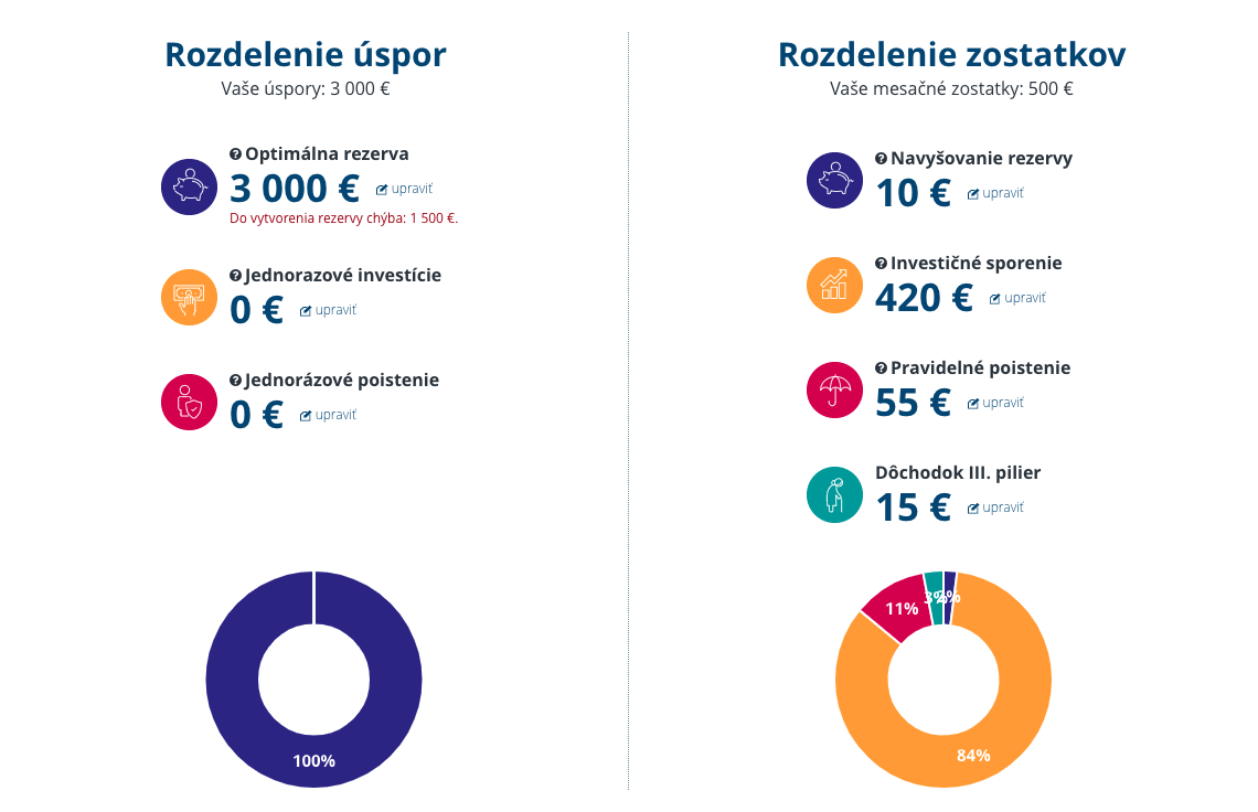 Napríklad 30-ročný Slovák, ktorý mesačne v čistom zarobí 1 500 €, z toho mu 500 € ostane a má už vytvorenú rezervu, by sa mal v prvom rade zamerať na investičné sporenie. Časť peňazí by tiež mala smerovať do pravidelného poistenia alebo do II. alebo III. piliera. Pre takéto odhady bol doteraz potrebný finančný poradca, dnes to zvládne šikovná webstránka.