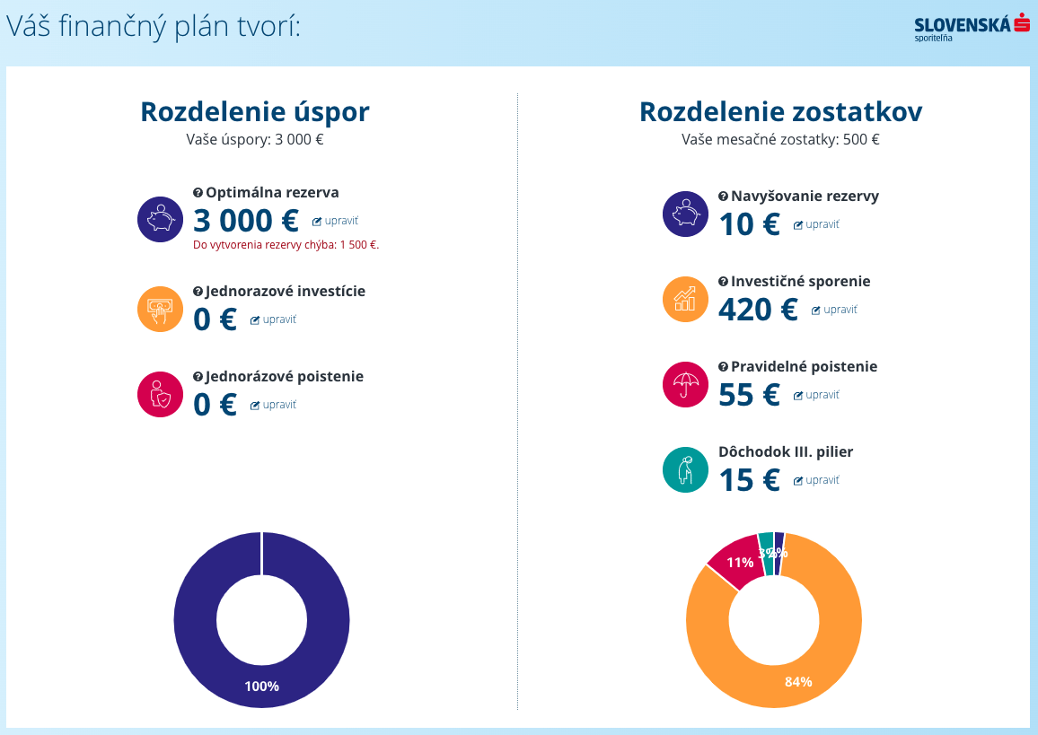 Finančný plán od Slovenskej sporiteľne však zvládne optimalizovať financie okamžite a online – zadarmo. Financie systém inteligentne prerozdelí, pričom myslí aj na optimálnu rezervu i s poistením a dostatočnými investíciami.