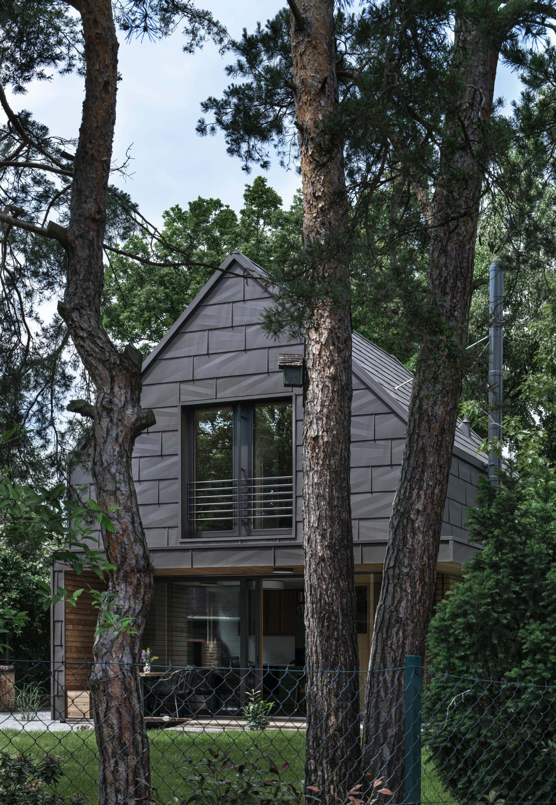 V okolí sú statné vysoké ihličnany, ktoré architektov očarili a ich vzor sa odráža aj vo fasáde. Tá je tvorená tmavohnedými hliníkovými šablónami a svojím tvarom pripomína šišku zo stromu.