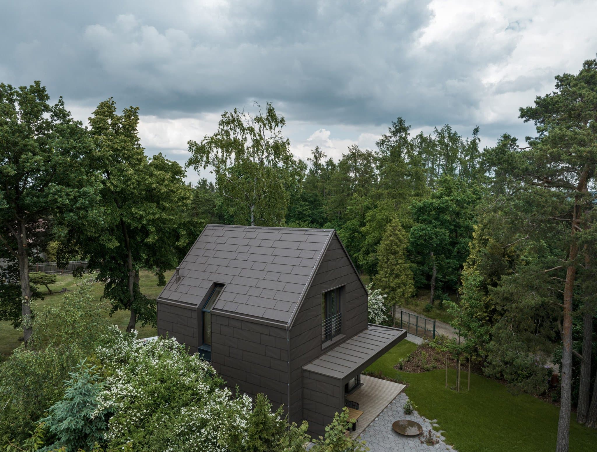 Hliníkový povrch fasády zaručuje ľahkú údržbu a dlhú životnosť a napĺňa zásadnú požiadavku na praktickosť. Náležitosť s prírodou podporujú presklené posuvné plochy, ktoré prepájajú obytnú časť interiéru s okolím a tiež rozširujú pocit priestoru vo vnútri chaty.