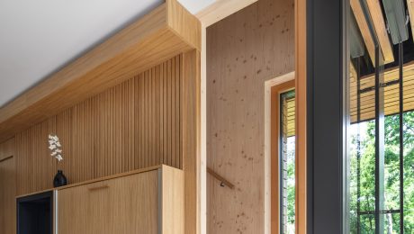 Preto nad ňu umiestnili knižnicu vrastajúcu do stropu a pre časti skriniek zvolili zjednocujúci motív dubového dreva s rovnakou profiláciou, akú má stena pri krbe. Jedálenský stôl sa prirodzene včlenil medzi kuchynské skrinky.