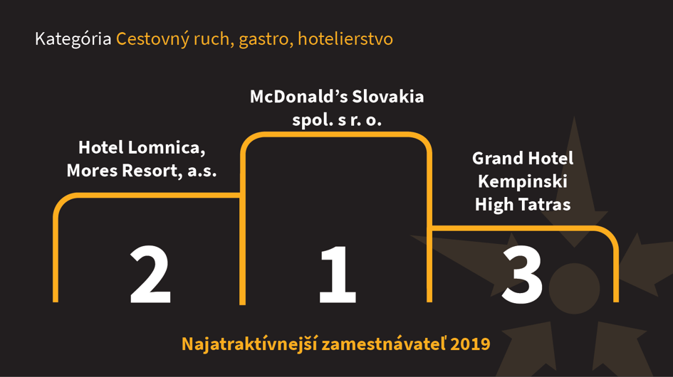 Cestovnému ruchu a hotelierstvu vládne fastfoodový reťazec McDonald’s. Ten na Slovensku za posledné mesiace zavádza novinky smerom k zákazníkovi, ktorý ho za ústretovosť a promptnosť veľmi ocenil. Na ďalších dvoch priečkach sa ocitli siete tatranských hotelov, tých najlepších a najznámejších, aké na Slovensku máme. V rámci cestovného ruchu využívajú Slováci čím ďalej tým viac domáce služby, majú vysoké nároky a zamestnávatelia vedia oceniť prácu svojich zamestnancov.
