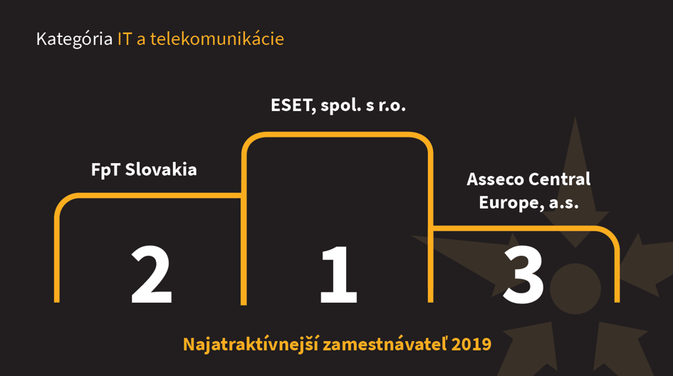 V kategórii IT a telekomunikácií si svoju pozíciu z minulého roka polepšila spoločnosť ESET, ktorá sa z tretej pozície dostala na prvú. Kadžý, kto pracuje v tejto firme vie, že podmienky, ktoré zamestnávateľ ponúka, sú nadštandardné. Okrem nich sa v kategórii nachádzali Orange Slovensko, ale aj O2 či spoločnosť Unicorn a košický T-Systems Slovakia.