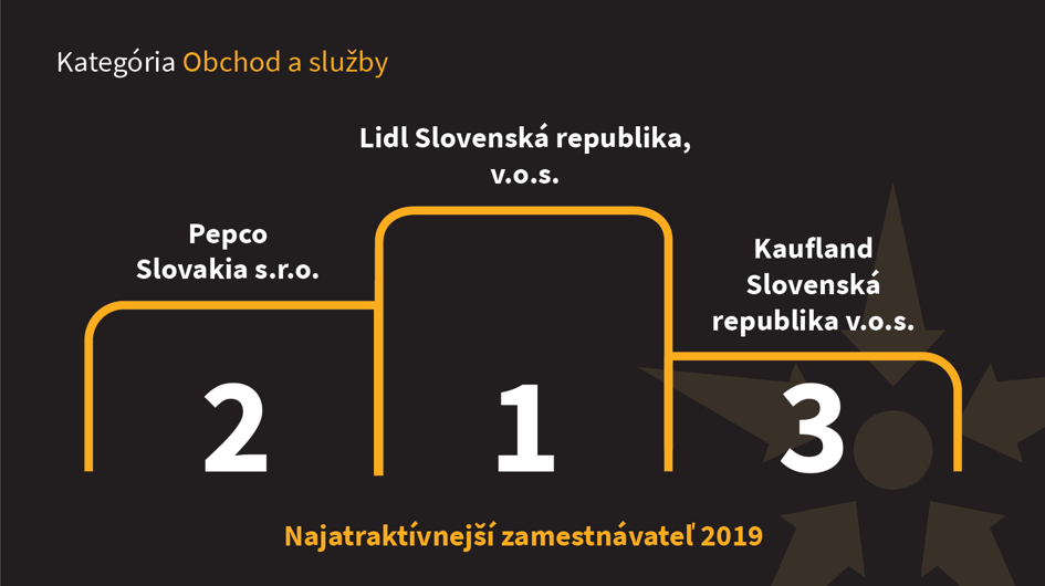 Obchod a služby majú najvýraznejšie obsadenie a zamestnávatelia, zamestnanci, ale aj laická verejnosť ich veľmi intenzívne vníma. Spadá sem veľké množstvo značiek, predajných sietí a veľmi konkurencieschopných firiem európskej a svetovej pôsobnosti. Medzi kandidátmi na víťaza sa ocitla obľúbená dm drogerie markt, GymBeam, Starbucks, Kofola či Martinus.