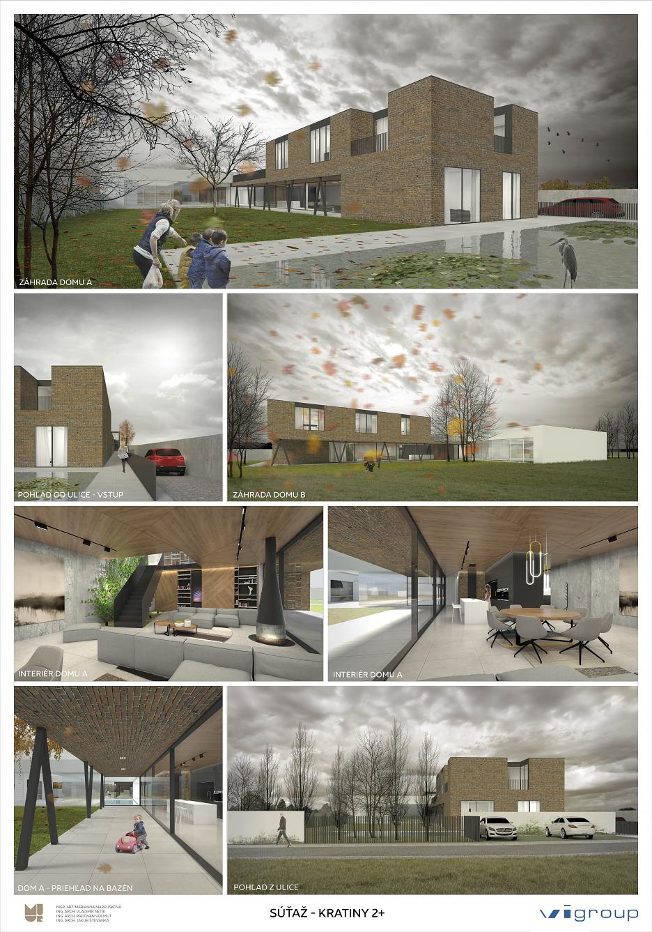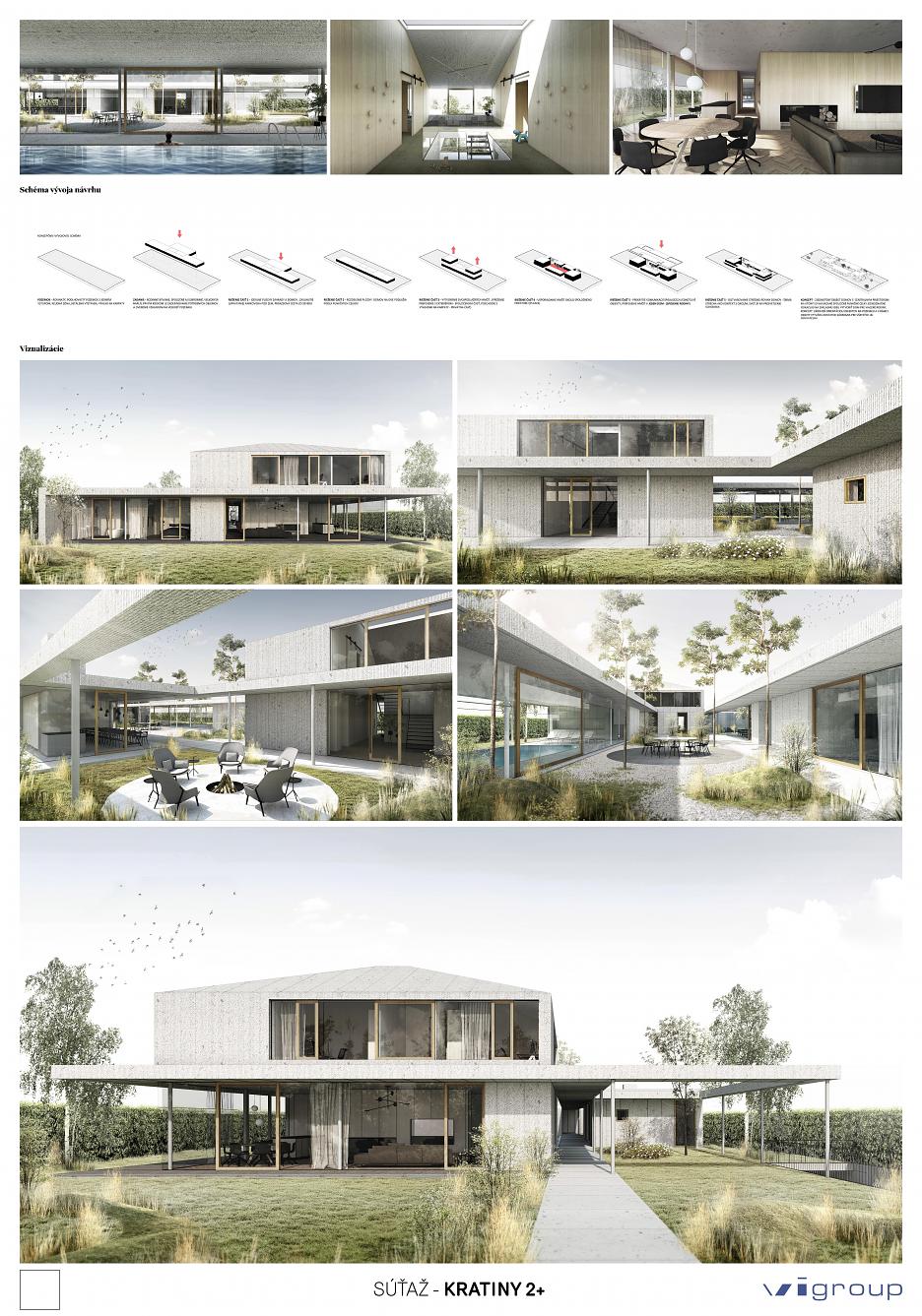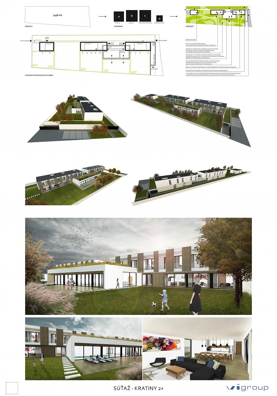 Predmetom verejnej architektonickej súťaže Kratiny 2+ bol návrh dvoch rodinných domov a seniorskej bunky v kontexte s komplexným návrhom využitia pozemku pre tri generácie. Cieľom bolo čo najoptimálnejšie usporiadanie objektov v snahe získať priestorovo a funkčne bezkolízne prepojenie spoločných zón a zároveň zachovať istú mieru súkromia jednotlivých rodín. Hlavnou úlohou bolo navrhnúť symbiotické bývanie dvoch mnohopočetných rodín ako aj seniorskej bunky. Zámerom bolo vytvoriť dva samostatné rodinné domy so zdieľanými pridruženými funkciami a záhradný domček.