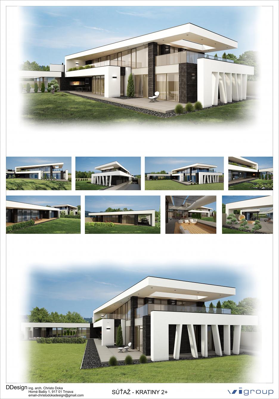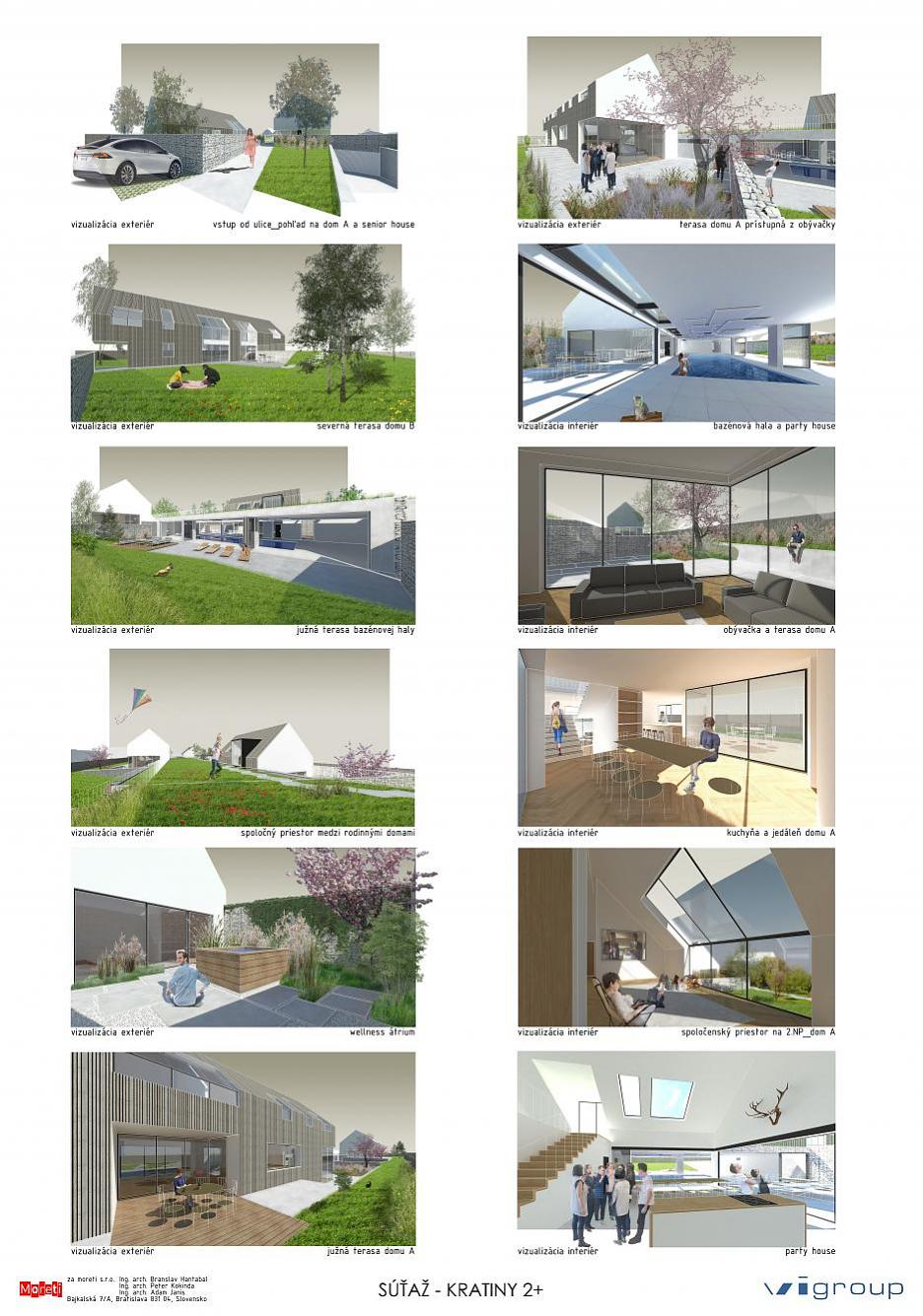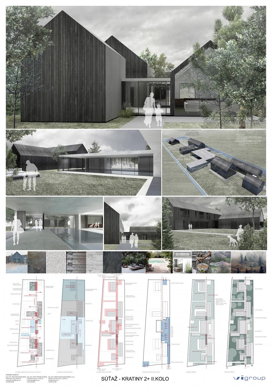 Predmetom verejnej architektonickej súťaže Kratiny 2+ bol návrh dvoch rodinných domov a seniorskej bunky v kontexte s komplexným návrhom využitia pozemku pre tri generácie. Cieľom bolo čo najoptimálnejšie usporiadanie objektov v snahe získať priestorovo a funkčne bezkolízne prepojenie spoločných zón a zároveň zachovať istú mieru súkromia jednotlivých rodín. Hlavnou úlohou bolo navrhnúť symbiotické bývanie dvoch mnohopočetných rodín ako aj seniorskej bunky. Zámerom bolo vytvoriť dva samostatné rodinné domy so zdieľanými pridruženými funkciami a záhradný domček.