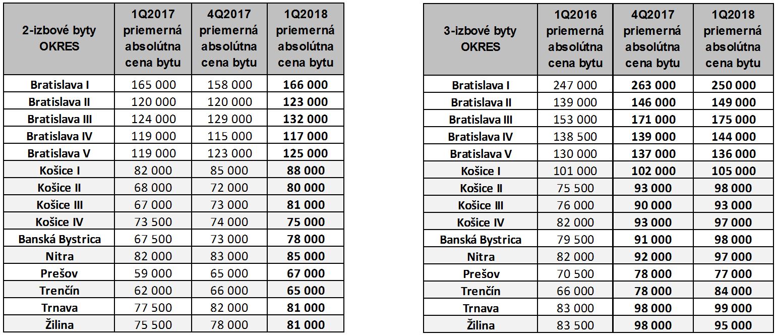 Ceny v segmente 2-izbových bytov na bratislavskom trhu narástli v 1. štvrťroku 2018 oproti poslednému štvrťroku 2017 o 2,6 %, pričom najdrahšou lokalitou zostáva Staré mesto. Ostatné krajské mestá Slovenska zaznamenali nárast cien 2-izbových bytov v prvom štvrťroku 2018 oproti poslednému štvrťroku 2017 v priemere o 4 %.