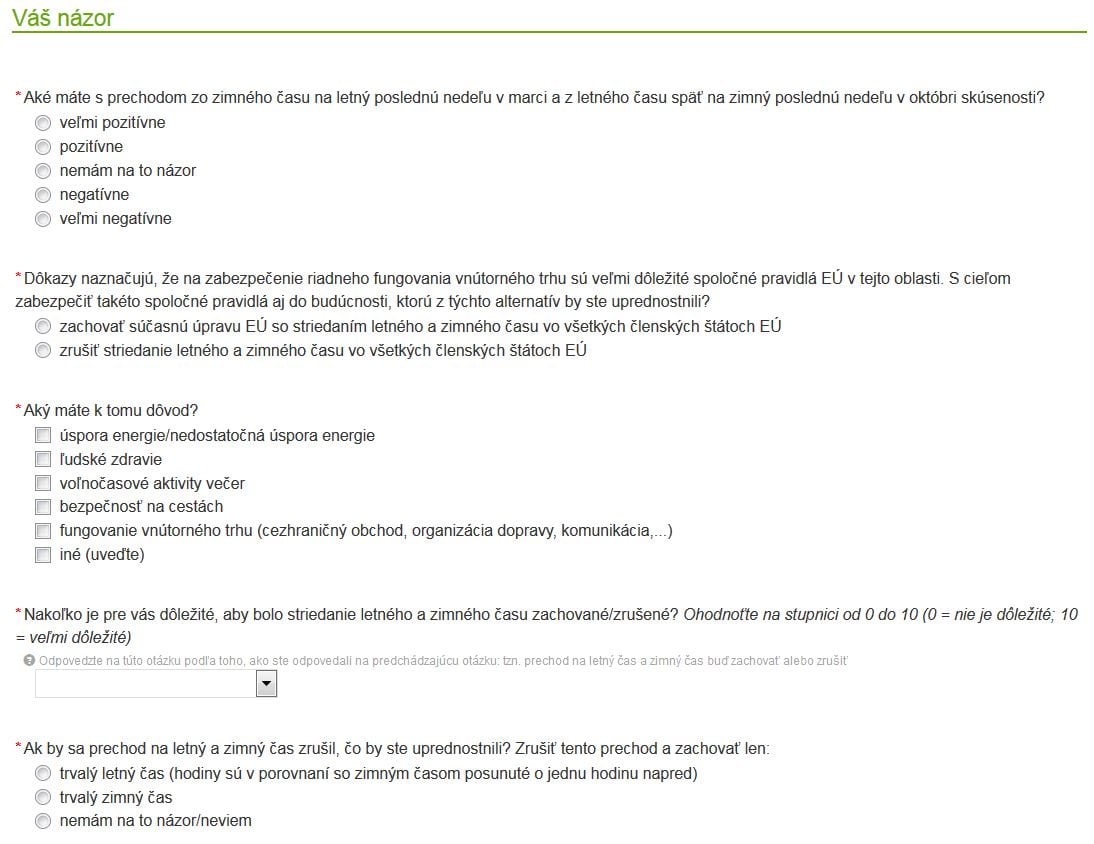 Anketa obsahuje niekoľko krokov. V úvode Komisia vysvetľuje vytvorenie ankety na základe množstva podnetov od značného počtu občanov, potom nasleduje vypĺňanie základných informácií o hlasujúcom, samotné hlasovanie v piatich jednoduchých otázkach (viď. obrázok) a nakoniec aj priestor pre prílohy a obšírnejšie poznámky k téme.