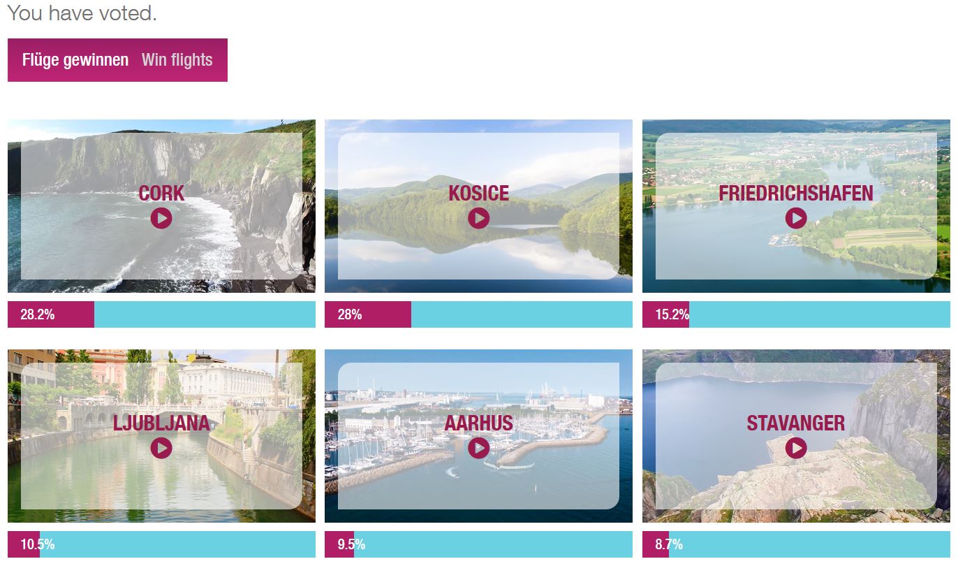 Nízkonákladová letecká spoločnosť Eurowings bola v roku 2017 zvolená za najlepšiu nemeckú aerolinku a v súčasnosti spustila už druhú edíciu súťaže Vote and fly!, teda Hlasuj a leť! Od 6. do 12. marca na webe vote-and-fly.com prebieha hlasovanie verejnosti, ktorá má na výber medzi dokopy šiestimi európskymi mestami. Košiciam je najväčšou konkurenciou írsky Cork, dánske mesto Aarhus, nemecký Friedrichshafen, hlavné mesto Slovinska, Ľubľana, a nórsky Stavanger.