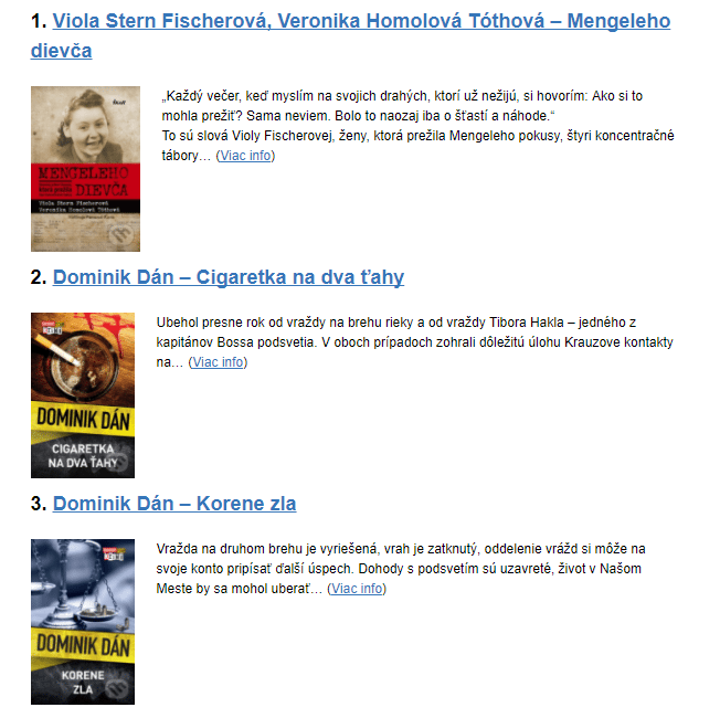 Druhou zaujímavosťou je, že zo všetkých troch rebríčkov je zrejmé, že Slováci nadovšetko milujú detektívky, záhady a drámu. Okrem Dominika Dána sa v nich pravidelne objavuje aj hviezda severskej detektívky, Jo Nesbo, Jozef Karika so svojou Vojnou mafie, Arpád Soltész a jeho Mäso alebo Paula Hawkins či záhady Hercula Poirota.
