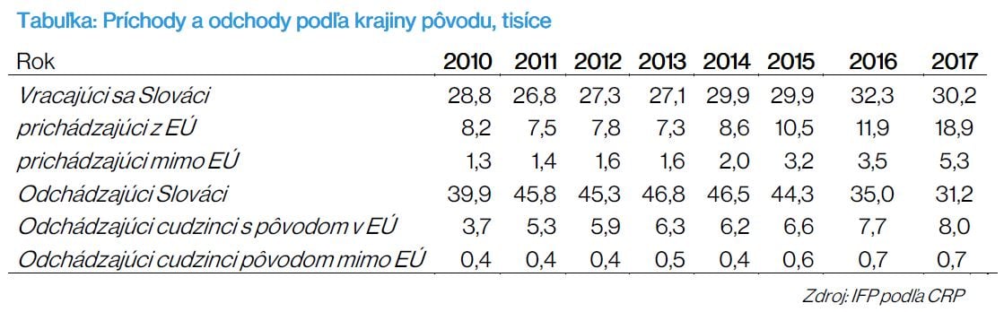 Pozitívne migračné saldo (viac Slovákov sa domov vracia než odchádza do zahraničia) Slovensko naposledy zaznamenalo v krízovom roku 2009. Autori analýzy podotkli zo zistených výsledkov nasledovné: „Bez príchodu občanov z iných krajín by bolo migračné saldo stále záporné. Kým v období od roku 2010 do 2015 prišlo každoročne späť približne 28 tisíc Slovákov, pre rok 2016 bol ich počet vyšší o 14 % (viac ako 32 tisíc vracajúcich sa Slovákov).“