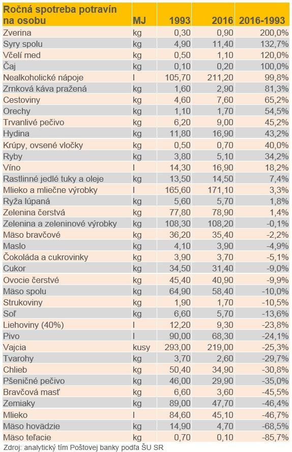 Slovensko tento rok oslavuje svojich 25 rokov samostatnosti. Za štvrťstoročie sa v návykoch spotrebiteľov mnohé zmenilo najmä vďaka otvoreniu hraníc. Prišla nová móda, technológie, ekonomika sa pomaly postavila na nohy a súčasne s tým sa menila aj taká drobnosť, akou je náš jedálniček. Prepadli sme trendu zdravého životného štýlu alebo stále preferujeme sýtu slovenskú kuchyňu bez obmedzení? Zaujímavé informácie tentokrát zozbierala vďaka štatistickému úradu Poštová banka.