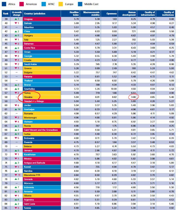 Hoci práve tento index nás posunul na 10. priečku odspodu v rámci Európy, o niečo lepšie bodové ohodnotenie sme dosiahli pri makroekonomickej stabilite, kde sme získali dokopy 6,01 bodu a zaostávajú za nami také krajiny, ako napríklad Holandsko, Fínsko, Británia, ale napríklad aj Kanada. V oblasti otvorenosti ekonomiky, ktorá ráta s prítokom zahraničných investícií, sme však dosiahli vysoké hodnotenie v podobe 8,62 bodu, no sú aj krajiny, ktoré obišli s plným počtom desiatich bodov – napríklad Luxembursko alebo Írsko. V oblasti kvality infraštruktúry Slovensko dosiahlo 4,65 bodu a sila verejných inštitúcií je ohodnotená len 4,65 bodmi.