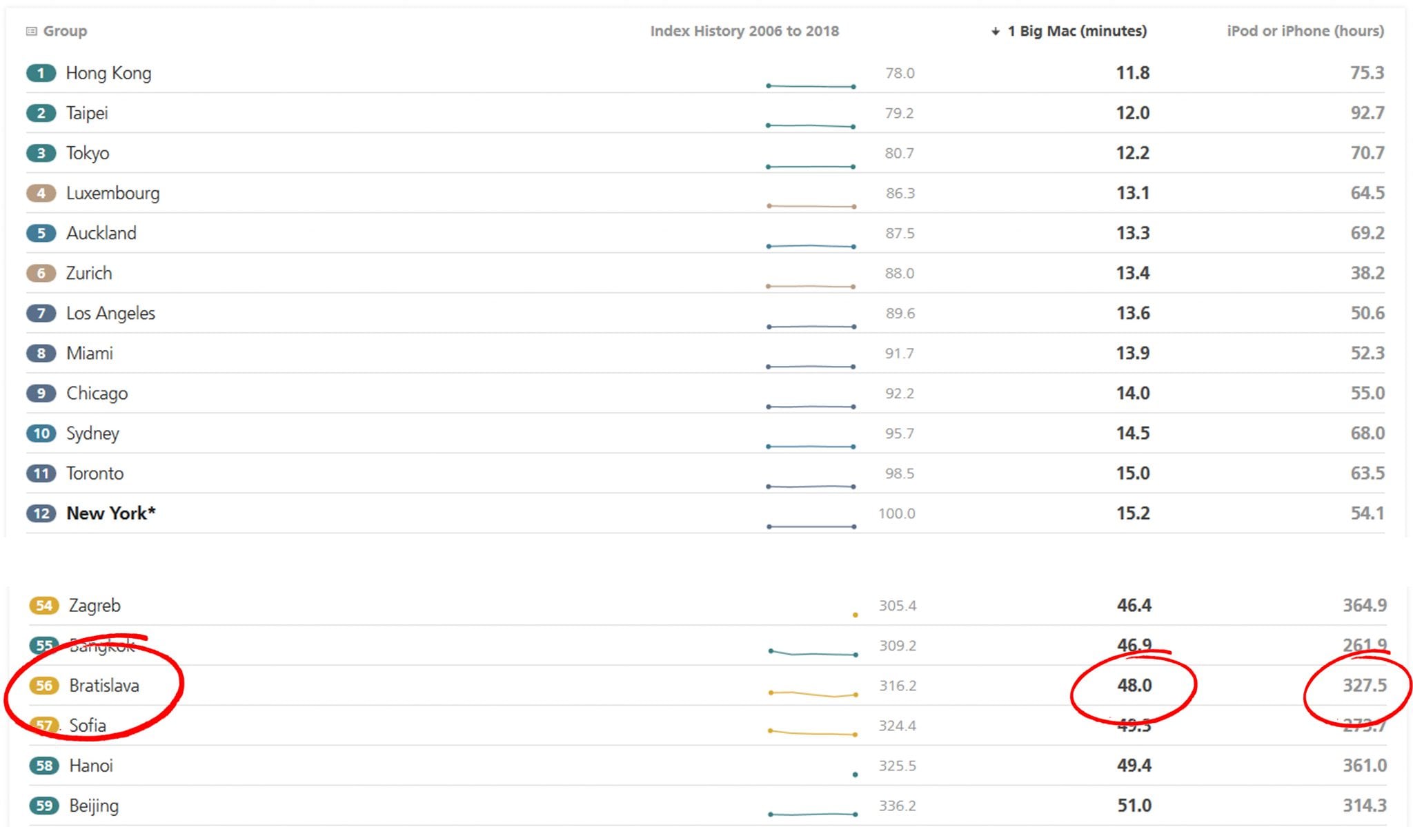 Zamerajme sa však na ďalší bod programu, a teda veľmi obrazné porovnanie množstva odpracovaných hodín, ktoré by musel mať za sebou Bratislavčan vs. obyvateľ iných metropol, aby si mohol dovoliť nový iPhoneX alebo dať si v McDonalde BigMac. Dostali sme sa na 56. priečku. Zatiaľ čo v Hong Kongu si na nový iPhone zarobia za hodinu a 15 min. a na BigMac za menej ako 12 minút, Slováci si musia počkať dlhšie (viď. tabuľka).