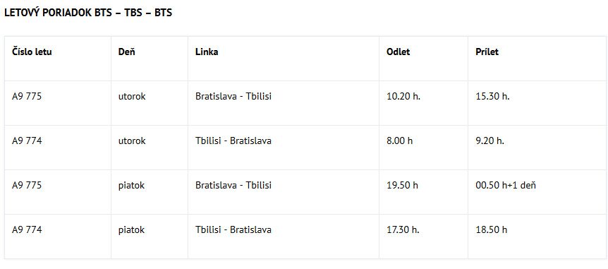 Priame lety do gruzínskej metropoly Tbilisi a z nej budú prevádzkované novým typom lietadla Embraer 190 JET 94-106 s kapacitou 88 miest v ekonomickej triede a 9 miest v biznis triede. Let potrvá približne 3 hodiny a na palube je cestujúcim servírované teplé občerstvenie a ponuka teplých a studených nealkoholických nápojov.