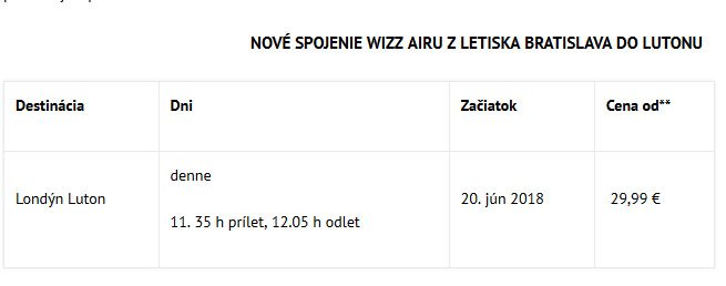 Wizz Air otvorí v lete priame letecké spojenie medzi Letiskom Bratislava a Londýnom-Lutonom. Od 20. júna 2018 bude Wizz Air lietať medzi Bratislavou a Londýnom každý deň s cenami leteniek už od 29,99 €. Rozšíri tak slovenským cestujúcim možnosti využívania servisu na palube lietadiel jednej z najmladších flotíl v Európe.