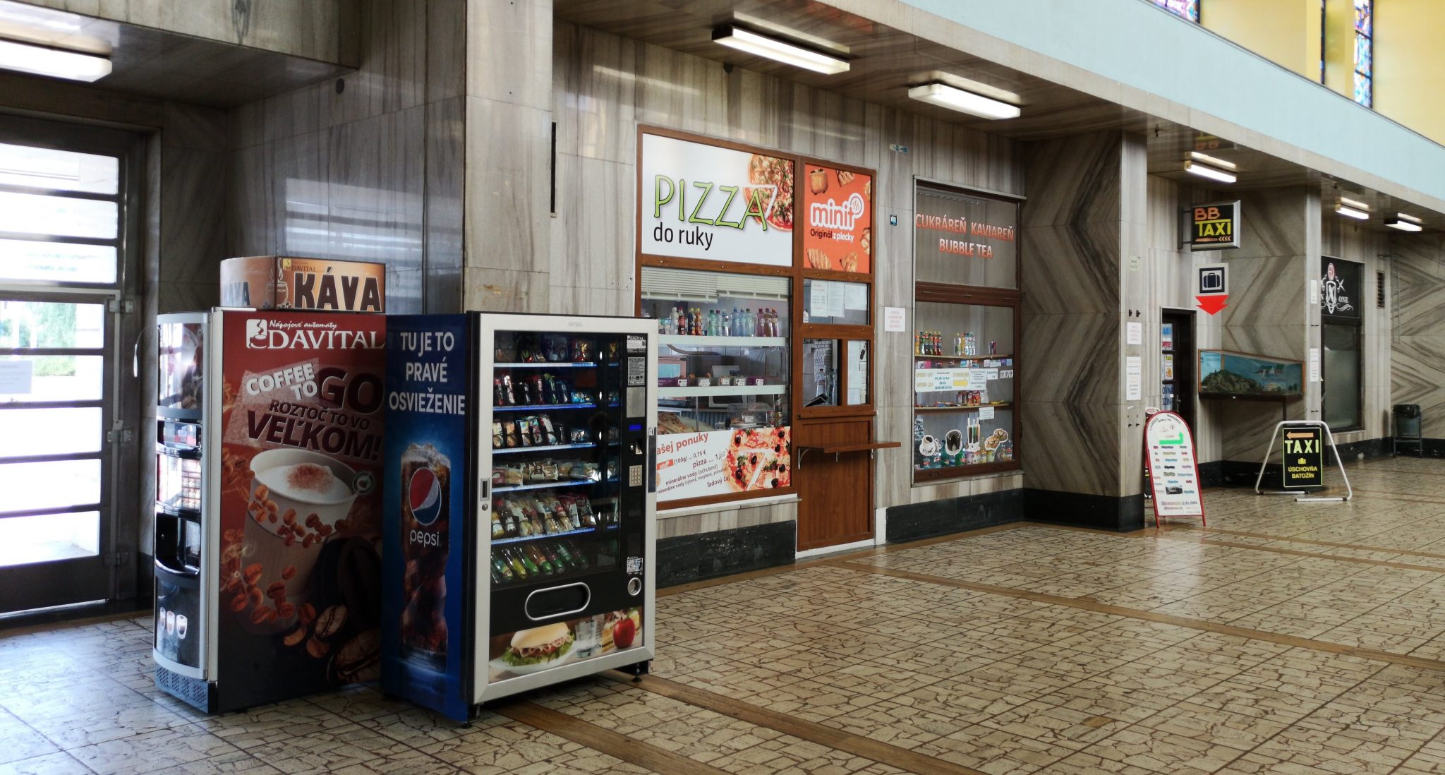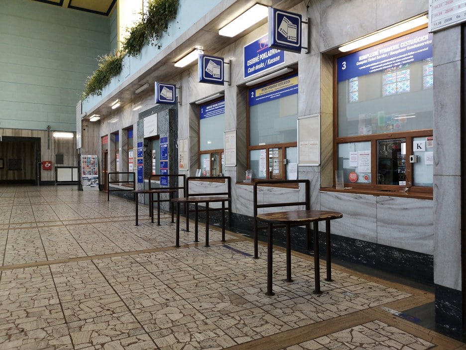 Južná stena odbavovacej haly s pokladňami. Steny sú obložené lešteným mramorom.