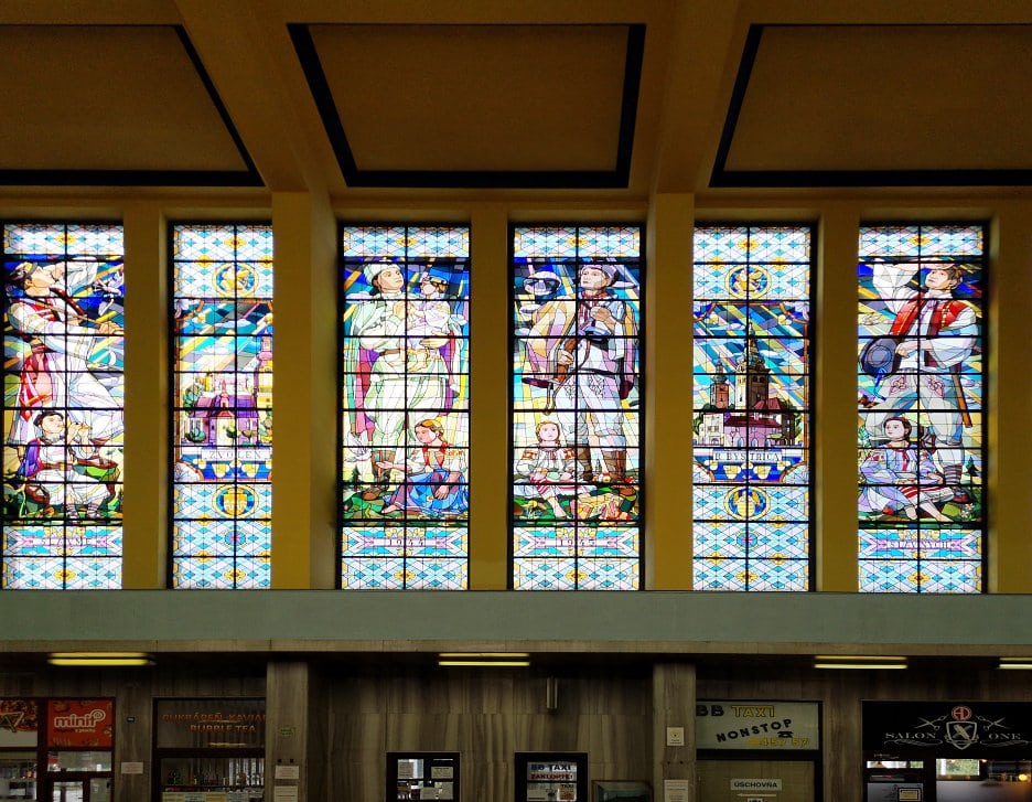 V interiéri odbavovacej haly železničnej stanice Banská Bystrica je kvôli jej presvetleniu umiestnených 8 vysokých okien. Pôvodne boli zasklené len reliéfnym sklom, aby do priestoru odbavovacej haly vnikalo rozptýlené svetlo. V roku 1959 pribudli umelecké vitráže s motívmi stredoslovenských miest – Banskej Bystrice, Banskej Štiavnice, Brezna a Zvolena, ktoré sú charakterizované ich historickými dominantami (4 vitráže) a figurálnymi motívmi s textom SLÁVME SLÁVNYCH 1944 – 1945 oslavujúce ukončenie 2. svetovej vojny, Slovenské národné povstanie, oslobodenie a slovenský ľud (4 vitráže). Celá kompozícia je navrhnutá a realizovaná v intenciách socialistického realizmu, ktorý bol v tom čase základnou formou všetkých druhov umenia. V prípade železničnej stanice v Banskej Bystrici však nepôsobí násilne a v súčasnosti už tvorí prirodzenú súčasť interiéru a exteriéru odbavovacej haly. Dielo realizovali spolu traja tvorcovia. Ich mená sa objavujú na spodnom okraji jedného z vitrážových okien.