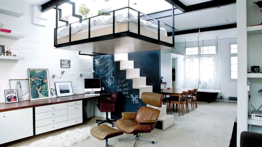 Zavesenie postele o strop nie je len praktickým riešením pre malé byty, ale taktiež to dominantný a naozaj vydarený dizajnérsky kúsok. Majitelia tohto londýnskeho bytu maximalizovali svoj obytný priestor tým, že zavesili svoju posteľ nad kancelársky priestor a strechu vybavili strešným oknom. Tým sa optimalizovalo množstvo prirodzeného svetla počas dňa a v noci sa naskytne krásny výhľad na hviezdnu oblohu.