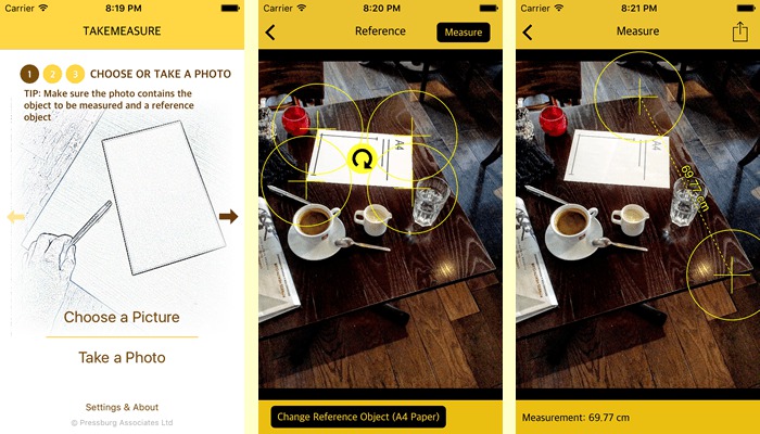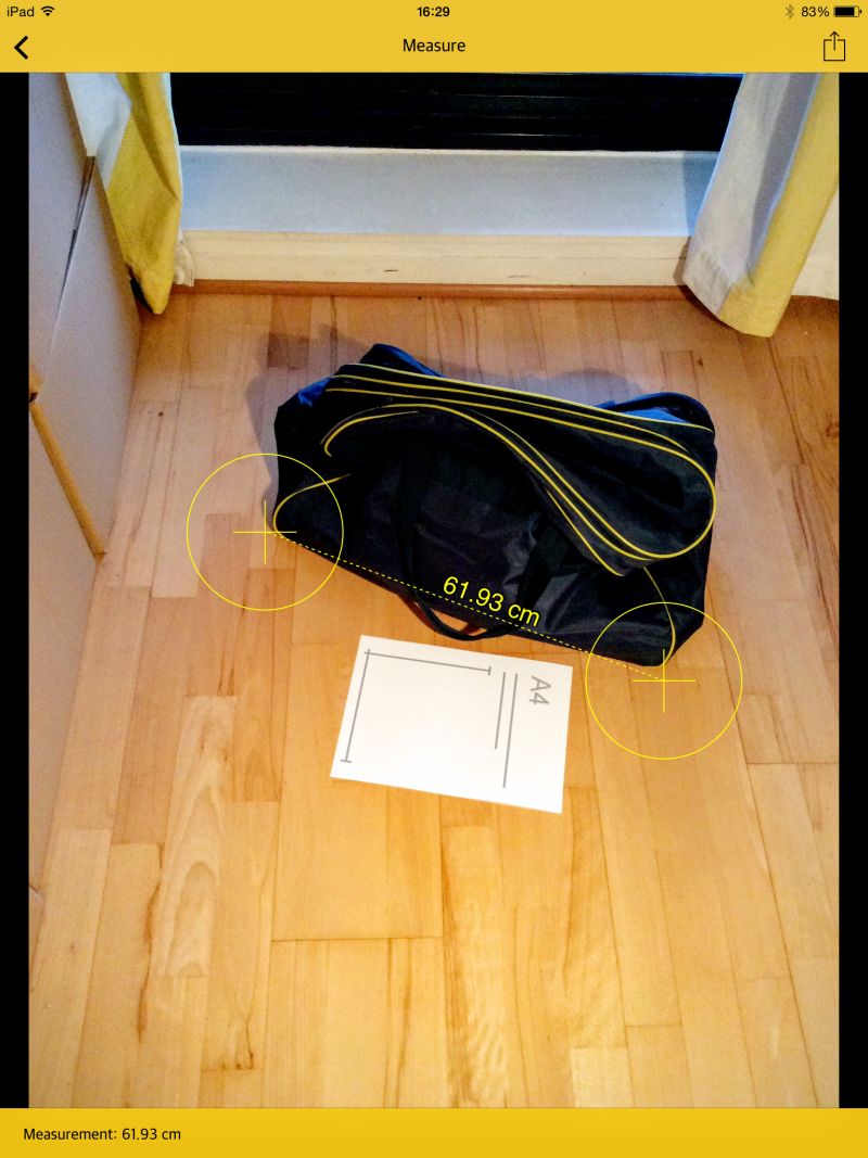 Najlepšie sa to opisuje na príklade. Predstav si, že chceš odmerať stôl. Položíš na neho list papiera A4 a urobíš fotku. V appke označíš papier a potvrdíš. Zrazu vieš merať všetko čo leží v rovine papiera, čiže napríklad hrany stola, alebo pero ktoré na ňom leží. Takto vieš zmerať nábytok, kufre, miestnosť, vlastne hocijaké veľké a malé veci, ktoré sa zmestia do fotky. Ako referencia sa dá okrem papiera použiť bankovka alebo karta peňaženkového formátu.
