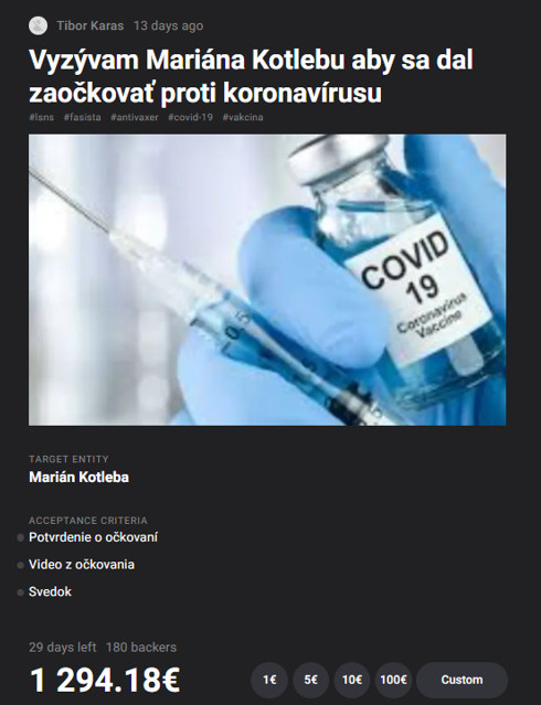 Aby sme však platformu neustále nerozoberali len na teoretickej úrovni, poďme sa pozrieť na to, aké výzvy sa v realite objavujú. K tým s najvyšším príspevkom možno zaradiť výzvu, ktorá je smerovaná Marianovi Kotlebovi. Obsah je jasný – má sa dať zaočkovať proti koronavírusu.