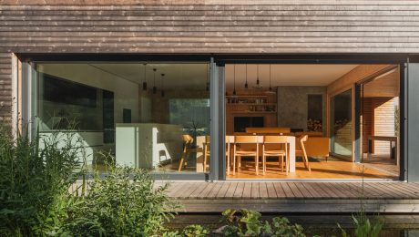 Jazierko nadväzuje priamo na hlavnú terasu, ktorá susedí s obývačkou. Dva veľké posuvné portály umožňujú, aby sa obývačka s kuchyňou a jedálňou v okamihu premenili na exteriérový salón – otvorený, priedušný a v neustálom kontakte s vonkajškom. Dom sa tak nestavia medzi človeka a prírodu, ale naopak – pozýva ju dnu.