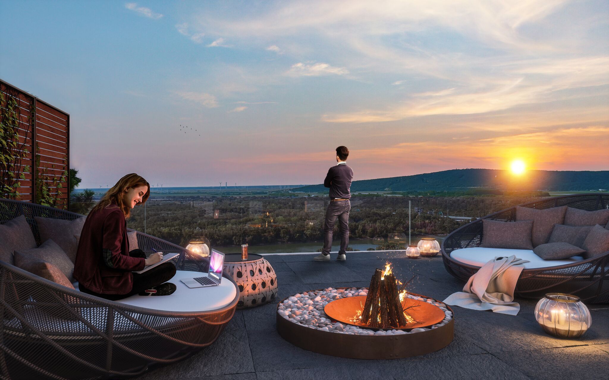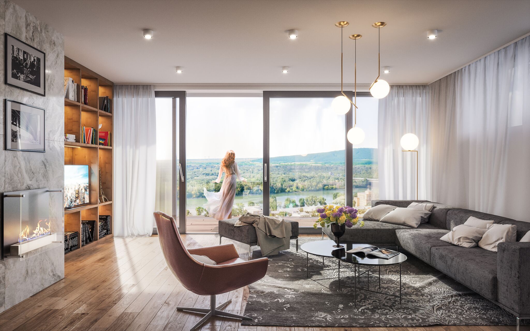 Veľkoformátové sklenené steny na všetkých podlažiach zabezpečujú nielen dostatok denného svetla v celom priestore, ale predovšetkým estetický pôžitok z ničím nerušeného panoramatického výhľadu na Dunaj.
