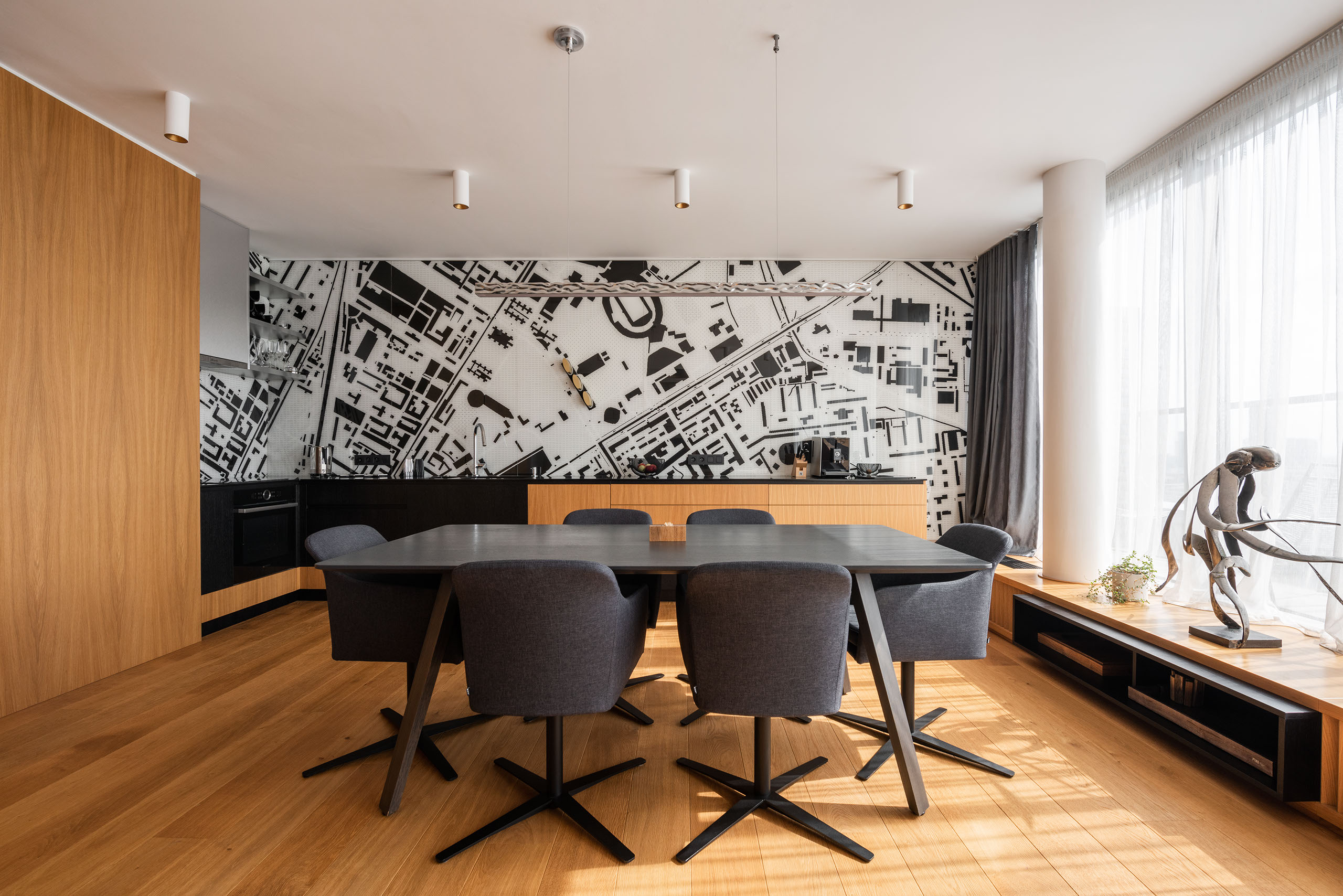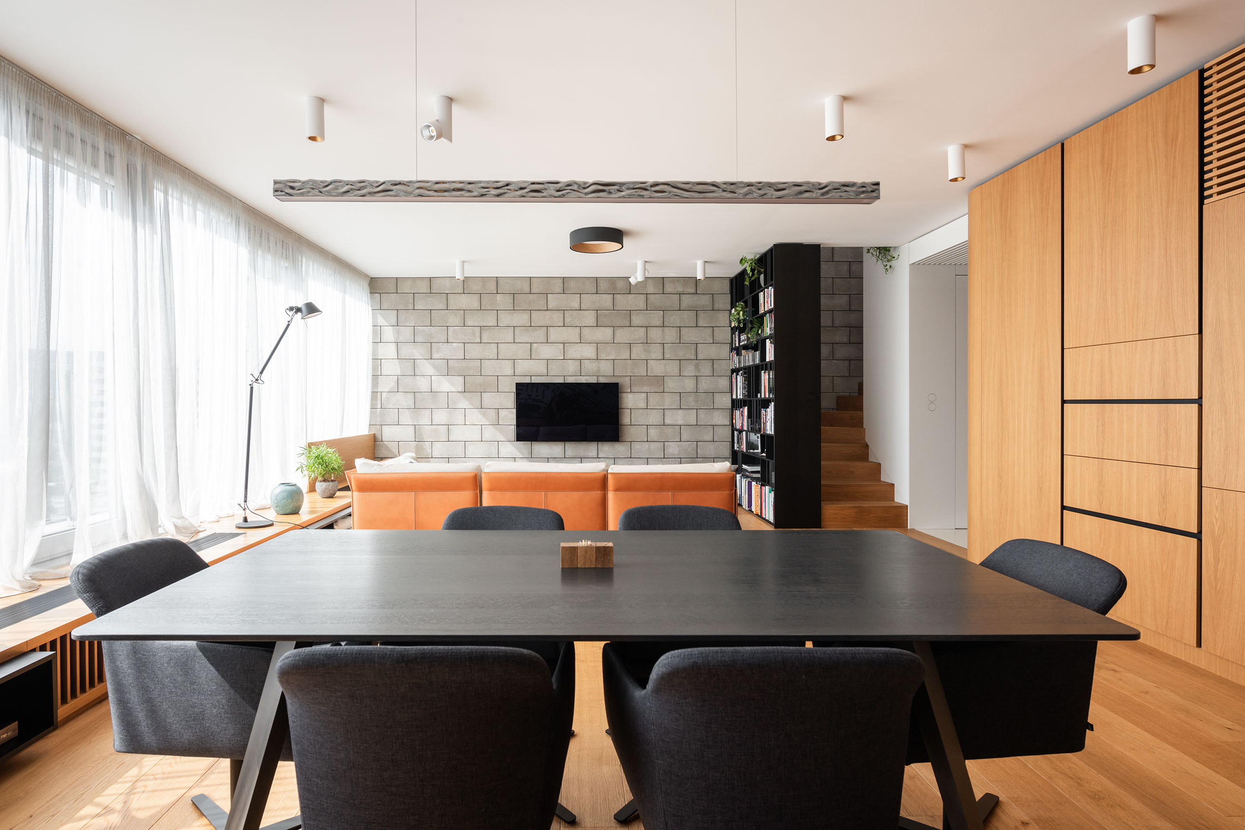 Na najvyšších podlažiach výrazného projektu sa nachádzajú mezonety, ktoré sú v dnešných dňoch čoraz vyhľadávanejšie. Jeden z nich si vzal do parády aj ateliér AT26 architects, ktorého úlohou bolo vytvoriť „trendom nepodliehajúci interiér, príjemný na bývanie a užívanie, s dôrazom na funkčnosť a kvalitu.“