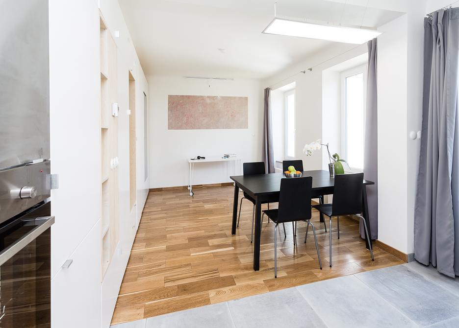 So vzhľadom sa nikto veľmi nemaznal. Strakatý dub bol v zľave, nábytok sa skoro celý vyskladal z IKEA a dlažbu obkladač takmer položil naopak, kvôli podobnému vzhľadu rubu a líca. Kvôli nedostatku omietkovej zmesi zostal na stene obraz pôvodného muriva. Nesmieme však zabudnúť na špe(r)k interiéru – na výklopnej skrini si stolári zamakali.