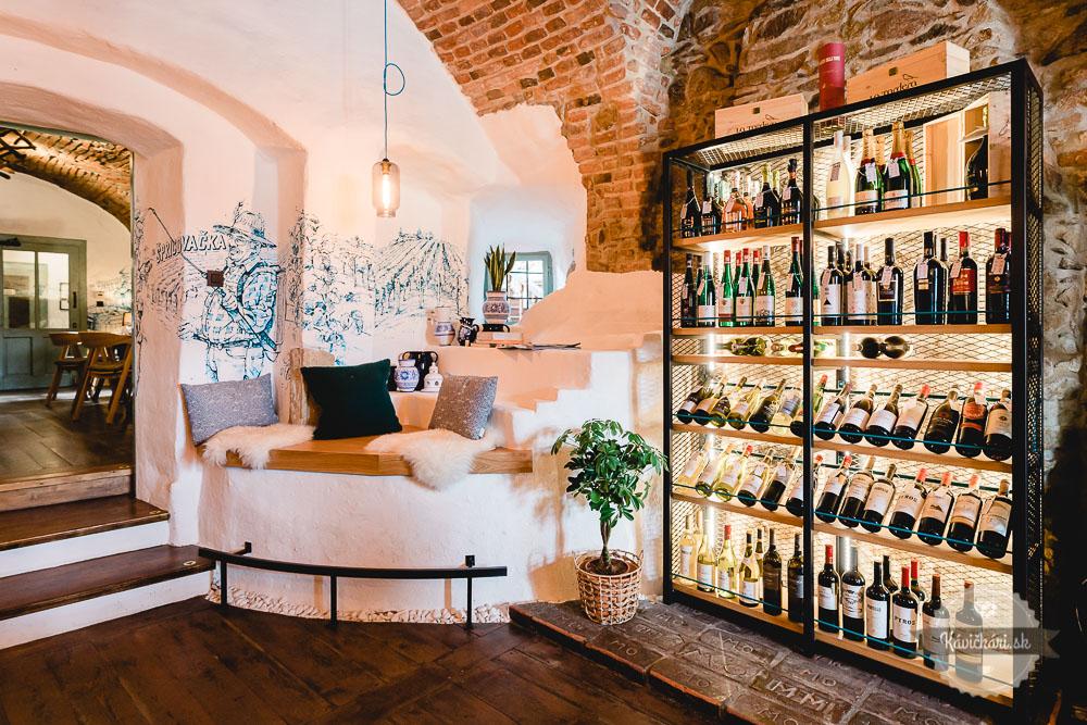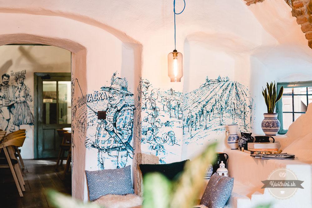 Miesto si tu našla modranská majolika, desatoro vinára či autorské maľby Dominika, ktoré zobrazujú príbeh a tvrdú prácu vo vinohrade. Tradičné vinárske prvky nájdete na strope, ktorý je dizajnovou čerešničkou.