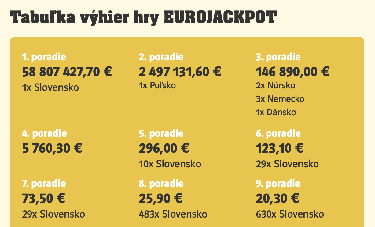 Slovenský výherca Eurojackpotu má 35 dní na to, aby sa o svoju výhru prihlásil. TASR o tom onformovala hovorkyňa spoločnosti Tipos Ivana Skokanová. Zároveň deklarovala, že identita výhercu nebude zverejnená a celý proces prebehne v prísnom utajení.