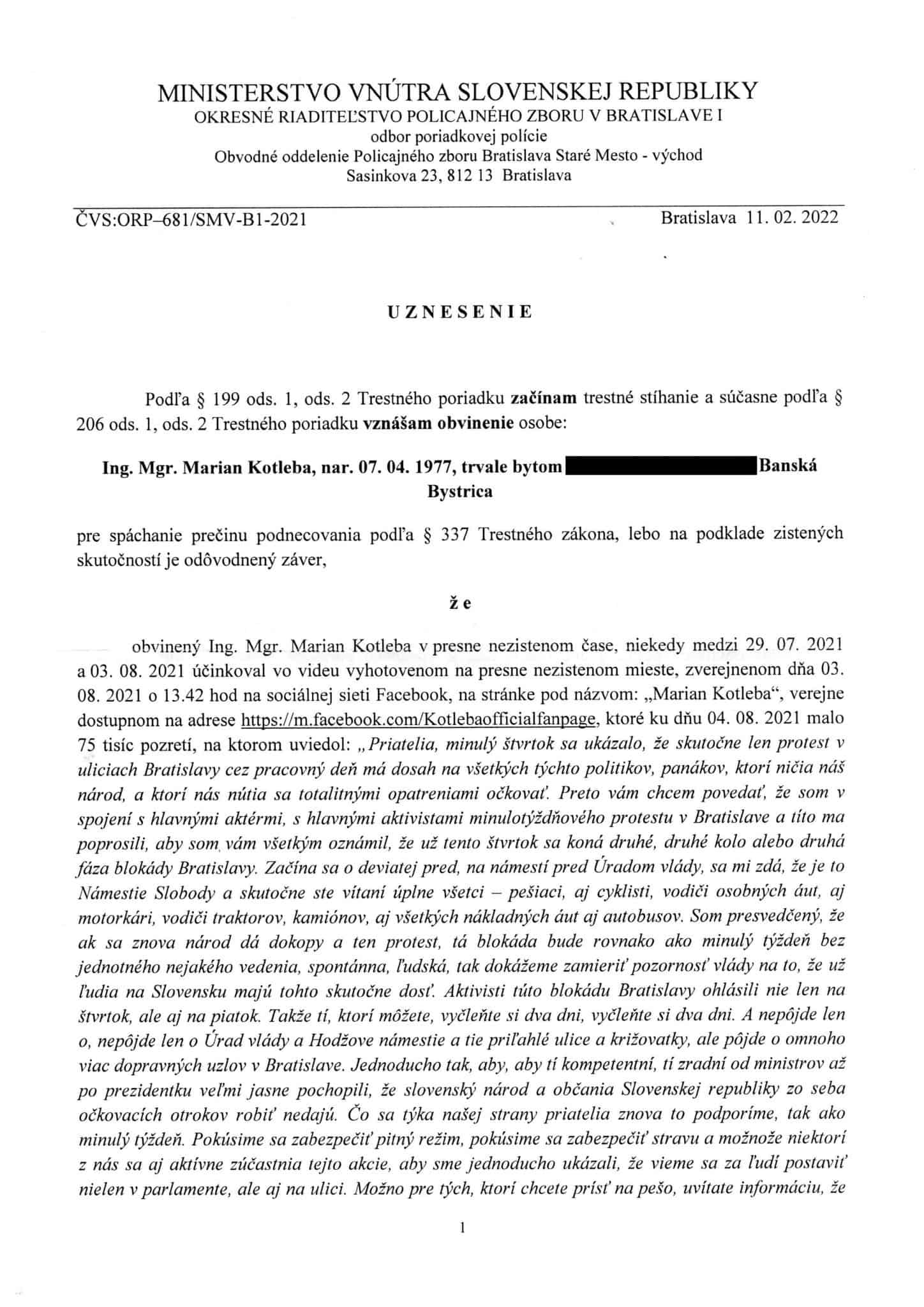 Portál Aktuality.sk dopĺňa, že TASR sa Kotlebovo obvinenie z podnecovania nepodarilo overiť na polícii. Síce im potvrdili, že skutočne bolo uznesené obvinenie z trestného činu podnecovania konkrétnej osobe, nepovedali im, či ide skutočne o Mariana Kotlebu.