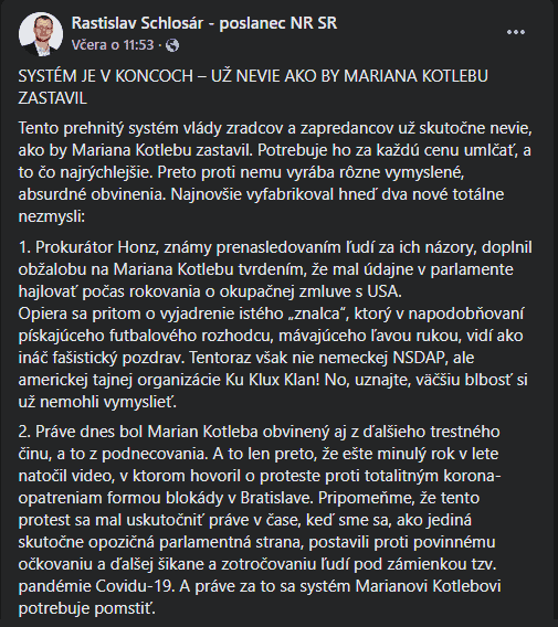 Schlosár pridal v pondelok na sociálnu sieť príspevok, v ktorom tvrdí, že bol Marian Kotleba obvinený z ďalšieho trestného činu. Obvinenie tentokrát súvisí s videom, ktoré Kotleba natočil a zverejnil v lete minulý rok.