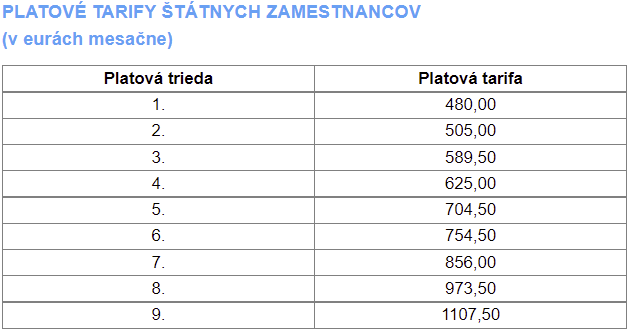 Súčasťou funkčného platu týchto štátnych zamestnancov bude podľa Tuchyňovej po ukončení trojmesačnej skúšobnej doby aj osobný príplatok podľa náplne práce. Ako môžeš vidieť v tabuľke platových taríf štátnych zamestnancov, v 9. platovej triede si dokážeš mesačne zarobiť 1 107,50 eur.