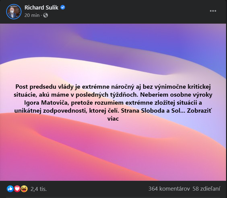 Na výlev Igora Matoviča už na Facebooku zareagoval aj minister Sulík. K výzve na demisiu však nepovedal nič. „Slovensko má teraz väčšie problémy, ako riešiť citové rozpoloženie Igora Matoviča,“ napísal. Sulík po niekoľkých minútach svoj status na sociálnej sieti zmazal.