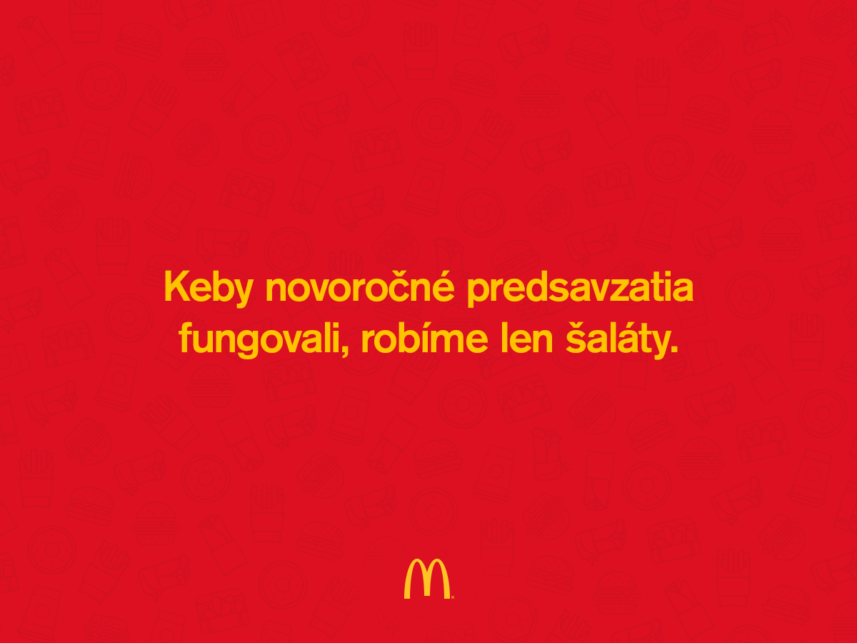 Na tento fakt vtipne zareagovala aj spoločnosť McDonald’s, ktorá hovorí, že keby novoročné predsavzatia fungovali, robili by len šaláty. Fastfoodový reťazec tak dáva do popredia svoje zdravšie pokrmy z ponuky svojho jedálnička. „Šaláty máme skvelé, ale kto by na nich vydržal celý rok, že?“