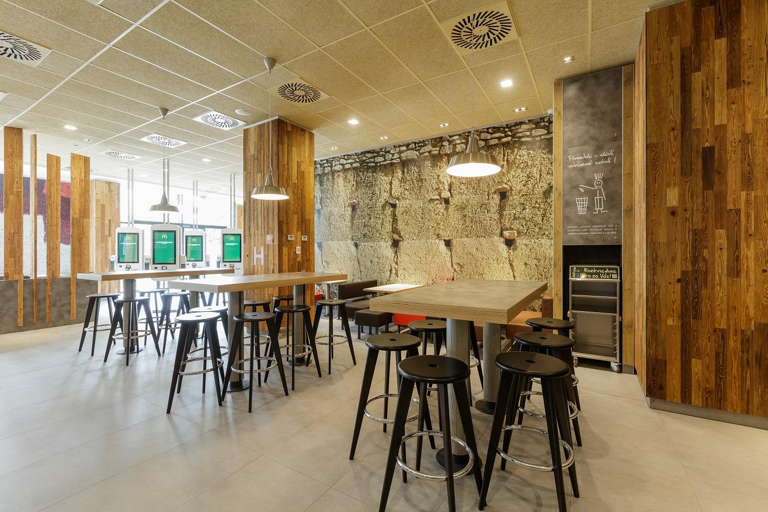 McDonald’s sa rozhodol ešte navýšiť vysokú latku nastavenú developerom a interiér novej prevádzky zariadil odvážnejšie, pričom stavil najmä na kombináciu dreva a odhalených kamenných stien.