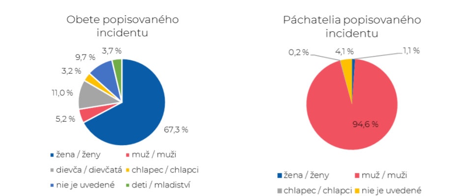 Väčšinovými prípadmi v mediálnom priestore však neprestávajú byť tie, ktoré rozoberajú násilie páchané na ženách. „Jednoznačná väčšina incidentov sexuálneho obťažovania, o ktorých bolo za rok 2020 informované v mediálnom priestore, sa týkala prípadov, kedy obeťami boli ženy (67,3 %), prípadne dievčatá (11 %), a páchateľmi boli muži (94,6 %),“ uvádza sa v správe mediálneho monitoringu SNSĽP.