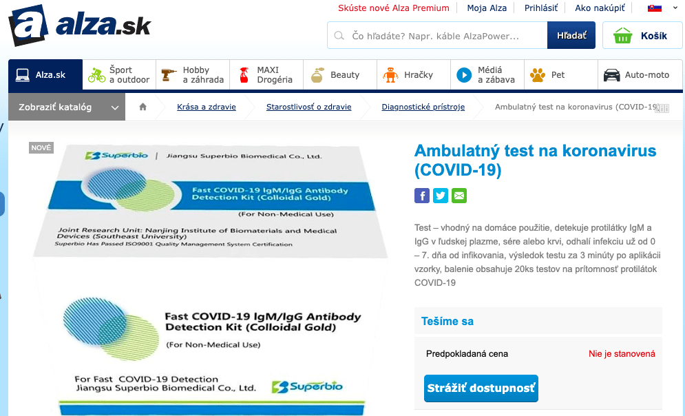 E-shop Alza.sk ponúka aj domácu testovaciu sadu. Ide o test čínskej spoločnosti Superbio, ktorá vo svete medicíny nie je žiadnym nováčikom. Ponúka viacero druhov testov, vrátane testov DNA a rôznych forenzných testovacích sád. Po novom ponúka aj test na koronavírus. Má fungovať na princípe koloidného zlata, ktoré reaguje na protilátky, ktoré sa tvoria u ľudí s ochorením Covid-19.