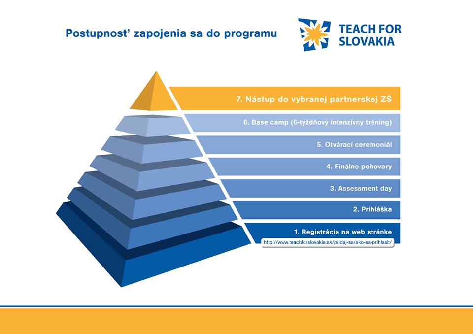 Prvým krokom k účasti v programe je vyplnenie registračného formulára na webovej stránke Teach for Slovakia. Na základe registrácie ťa bude kontaktovať tím TFS pre vyplnenie podrobnej prihlášky, súčasťou ktorej sú aj dve eseje. Aby si zvýšil svoje šance, vyhraď si na ňu dostatok času a pošli nám ju do 31. marca 2016.